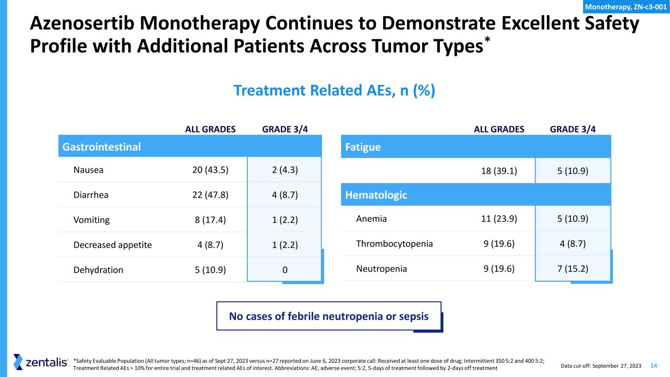 13 P ro gr e ss io n -F re e Su rv iv al P ro b ab ili ty 1.0 – 0.8 – 0.6 – 0.4 – 0.2 – 0.0 – 0 1 2 3 4 5 6 7 8 Months – – – – – – – – – Monotherapy Azenosertib Has Meaningful and Durable Benefit to Platinum Resistant Ovarian Cancer/USC Patients * Subjects who received at least one dose of azenosertib with intermittent dosing schedule, have baseline measurable disease by RECIST 1.1, and at least one post-baseline scan. Abbreviations: USC, uterine serous carcinoma; mPFS, median progression-free survival Data cut-off: October 25, 2023 Monotherapy, ZN-c3-001 mPFS mPFS (95% CI): 6.5 months (2.79, 6.87) At Risk 19 19 16 10 9 8 6 1 1 + = Censored
