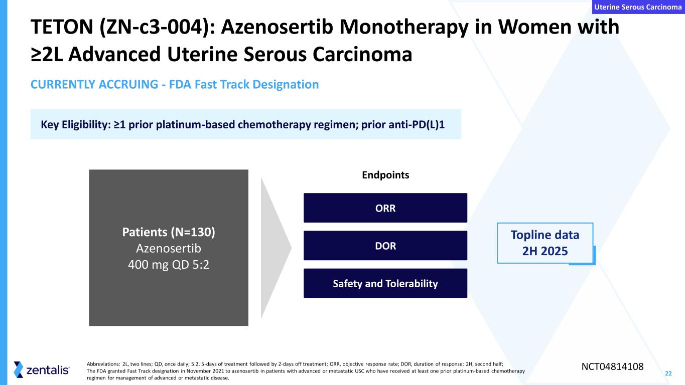 22 CURRENTLY ACCRUING - FDA Fast Track Designation Abbreviations: 2L, two lines; QD, once daily; 5:2, 5-days of treatment followed by 2-days off treatment; ORR, objective response rate; DOR, duration of response; 2H, second half; The FDA granted Fast Track designation in November 2021 to azenosertib in patients with advanced or metastatic USC who have received at least one prior platinum-based chemotherapy regimen for management of advanced or metastatic disease. TETON (ZN-c3-004): Azenosertib Monotherapy in Women with ≥2L Advanced Uterine Serous Carcinoma NCT04814108 Key Eligibility: ≥1 prior platinum-based chemotherapy regimen; prior anti-PD(L)1 Endpoints Patients (N=130) Azenosertib 400 mg QD 5:2 DOR Safety and Tolerability ORR Topline data 2H 2025 Uterine Serous Carcinoma