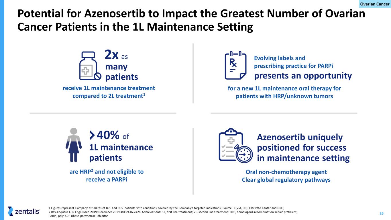 25 Abbreviations: 1L, one line; PFS, progression free survival; OS, overall survival; 2H, second half Azenosertib in 1L Maintenance Setting for Platinum Sensitive Ovarian Cancer Azenosertib + Bevacizumab Platinum Sensitive Ovarian Cancer Bevacizumab alone • Advanced Ovarian Cancer following 6 cycles of first line therapy with Carboplatin and Paclitaxel • Homologous Recombination Proficient (HRP) R 1:1 OS PFS