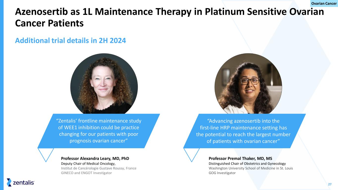 26 Potential for Azenosertib to Impact the Greatest Number of Ovarian Cancer Patients in the 1L Maintenance Setting 1 Figures represent Company estimates of U.S. and EU5 patients with conditions covered by the Company’s targeted indications; Source: IQVIA, DRG Clarivate Kantar and DRG; 2 Ray-Coquard I., N Engl J Med 2019; December 2019 381:2416-2428; Abbreviations: 1L, first line treatment; 2L, second line treatment; HRP, homologous-recombination repair proficient; PARPi, poly-ADP ribose polymerase inhibitor 2x many patients receive 1L maintenance treatment compared to 2L treatment1 as are HRP2 and not eligible to receive a PARPi 1L maintenance patients 40% of for a new 1L maintenance oral therapy for patients with HRP/unknown tumors presents an opportunity Evolving labels and prescribing practice for PARPi Oral non-chemotherapy agent Clear global regulatory pathways Azenosertib uniquely positioned for success in maintenance setting Ovarian Cancer