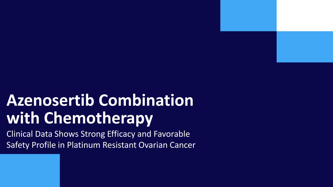 PFI<6m Second Line Therapy Combination Chemotherapy Platinum Doublet PFI>6m PFI<6m Platinum Resistant Single Agent Chemotherapy or Mirvetuximab (~35% pts)3 Opportunity for Azenosertib in First Line Maintenance in Homologous Repair Proficient (HRP) Platinum Sensitive Ovarian Cancer 1 Ray-Coquard I. N Engl J Med 2019; December 2019 381:2416-2428; 2 Figures represent Company estimates of U.S. and EU5 patients with conditions covered by the Company’s targeted indications; Source: IQVIA, DRG Clarivate; 3 Matulonis U. JCO 2023 41:13:2436-2445; Abbreviations: BRCAm, BRCA mutant; HRD, homologous-recombination repair deficient; HRP, homologous-recombination repair proficient; PFI, platinum-free interval Untreated Stage III/IV Ovarian Cancer Carboplatin + Paclitaxel First Line Maintenance PARP Inhibitor or Bevacizumab + Olaparib Bevacizumab BRCAm/HRD HRP Ovarian Cancer First Line Therapy 20,905 Treatable Patients2 US/EU5 ~40% patients are HRP/not eligible for maintenance PARP1 Unmet Need Platinum Sensitive
