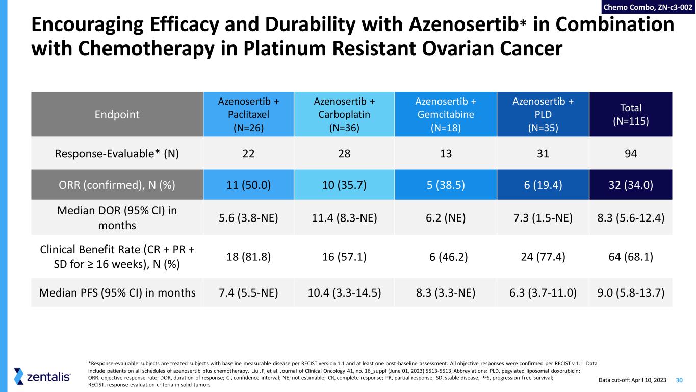 29 Azenosertib + Paclitaxel Azenosertib + Gemcitabine Azenosertib + PLD Azenosertib + Carboplatin Liu JF, et al. Journal of Clinical Oncology 41, no. 16_suppl (June 01, 2023) 5513-5513; Abbreviations: CRM, continuous reassessment model; QD, once daily; D, day; AUC, area under the curve; PLD, pegylated liposomal doxorubicin; MTD, maximum tolerated dose; RP2D, recommended Phase 2 dose; ORR, objective response rate; DOR, duration of response; PFS, progression-free survival ZN-c3-002: Phase 1b Combination Study in Platinum Resistant Ovarian Cancer Cohort assignment by availability and investigator preference Paclitaxel: 80 mg/m2 on D1, D8, D15 (28-day cycles) Objectives Gemcitabine: D1, D8 (21-day cycles) Carboplatin: AUC 5 mg/mL*min on D1 (21-day cycles) PLD: 40 mg/m2 D1 (28-day cycles) Dose Finding guided by a CRM Key Eligibility: Platinum-resistant/refractory; Up to 3 prior lines of chemotherapy Primary: Safety and Tolerability MTD and/or RP2D Key Secondary: Clinical Activity (Endpoints: ORR, DOR, PFS, CA 125) NCT04516447 Chemo Combo, ZN-c3-002