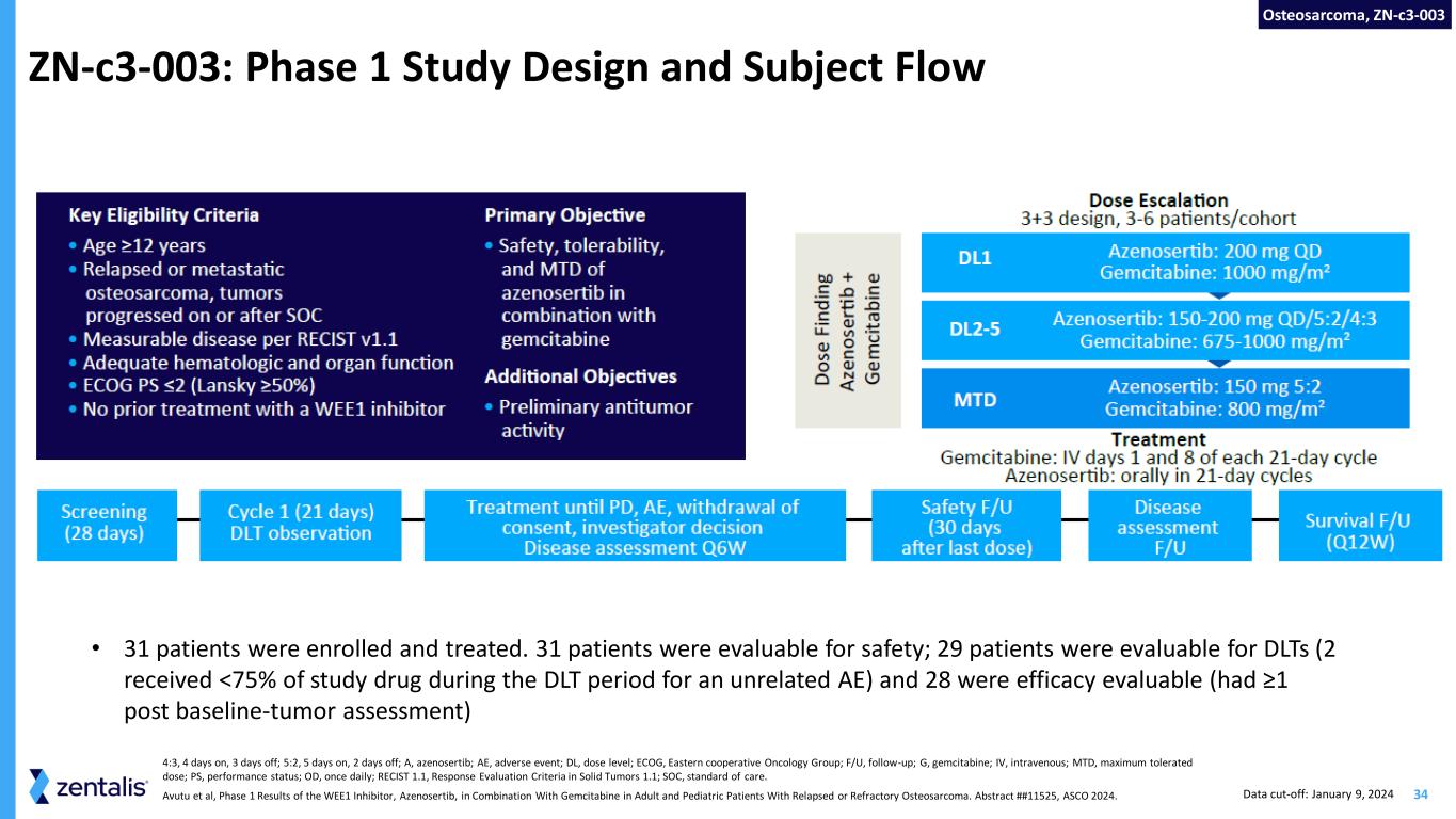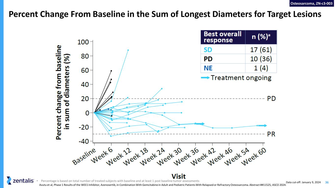 35 Doses Evaluated and Dose-Limiting Toxicities No evidence of a drug-drug interaction between azenosertib and gemcitabine was observed Pharmacokinetic results were consistent with those seen in azenosertib monotherapy and other chemotherapy combination studies with azenosertib Osteosarcoma, ZN-c3-003 Data cut-off: January 9, 2024 Avutu et al, Phase 1 Results of the WEE1 Inhibitor, Azenosertib, in Combination With Gemcitabine in Adult and Pediatric Patients With Relapsed or Refractory Osteosarcoma. Abstract ##11525, ASCO 2024.