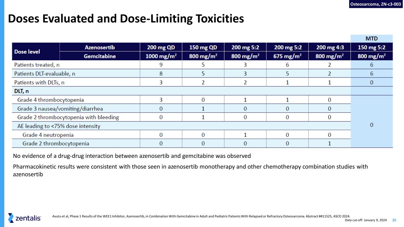 34 ZN-c3-003: Phase 1 Study Design and Subject Flow 4:3, 4 days on, 3 days off; 5:2, 5 days on, 2 days off; A, azenosertib; AE, adverse event; DL, dose level; ECOG, Eastern cooperative Oncology Group; F/U, follow-up; G, gemcitabine; IV, intravenous; MTD, maximum tolerated dose; PS, performance status; OD, once daily; RECIST 1.1, Response Evaluation Criteria in Solid Tumors 1.1; SOC, standard of care. Avutu et al, Phase 1 Results of the WEE1 Inhibitor, Azenosertib, in Combination With Gemcitabine in Adult and Pediatric Patients With Relapsed or Refractory Osteosarcoma. Abstract ##11525, ASCO 2024. • 31 patients were enrolled and treated. 31 patients were evaluable for safety; 29 patients were evaluable for DLTs (2 received <75% of study drug during the DLT period for an unrelated AE) and 28 were efficacy evaluable (had ≥1 post baseline-tumor assessment) Osteosarcoma, ZN-c3-003 Data cut-off: January 9, 2024