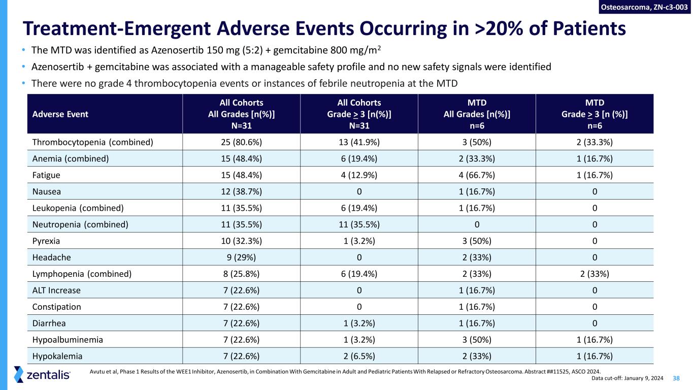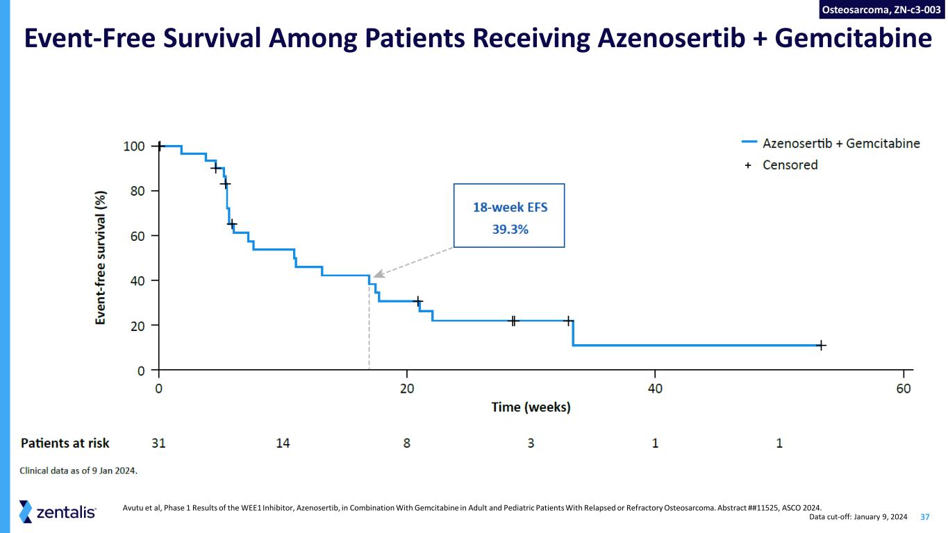 37 Event-Free Survival Among Patients Receiving Azenosertib + Gemcitabine Osteosarcoma, ZN-c3-003 Data cut-off: January 9, 2024 Avutu et al, Phase 1 Results of the WEE1 Inhibitor, Azenosertib, in Combination With Gemcitabine in Adult and Pediatric Patients With Relapsed or Refractory Osteosarcoma. Abstract ##11525, ASCO 2024.