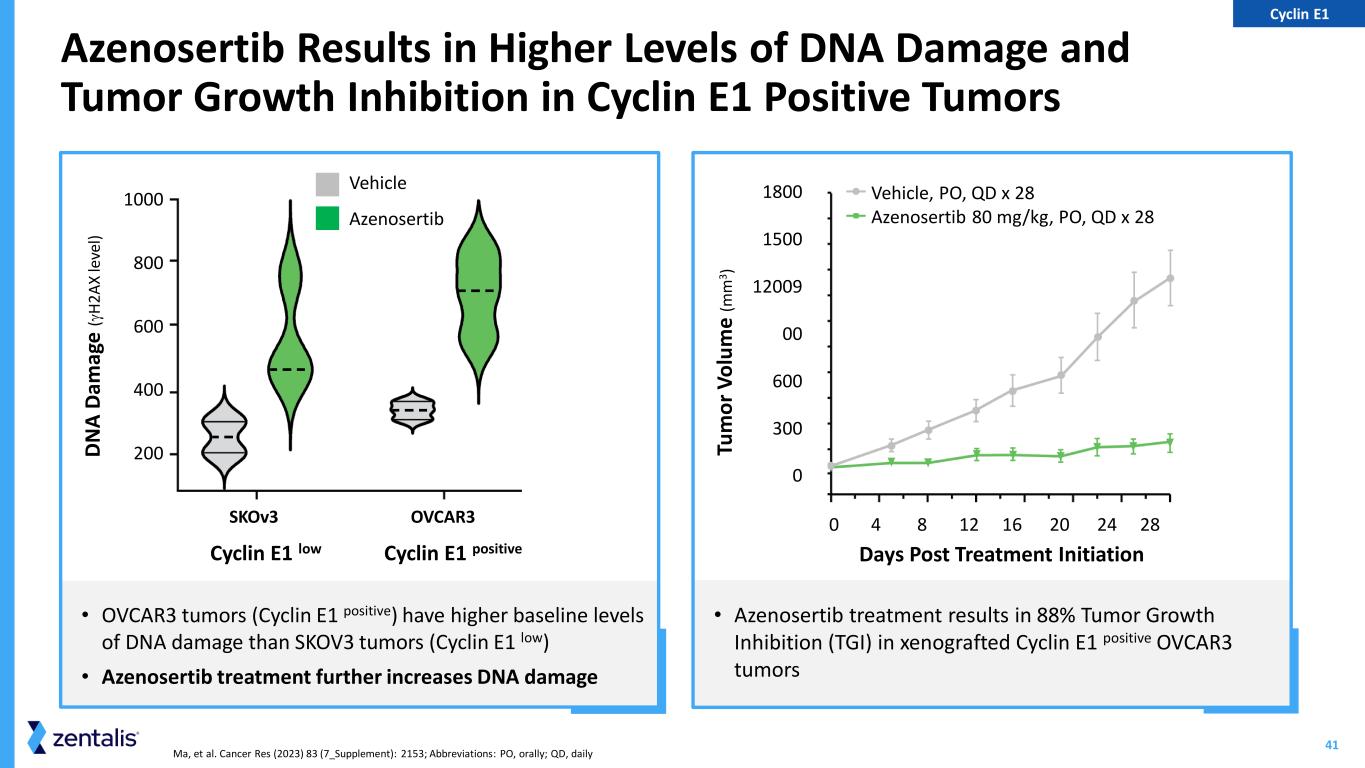 40 CDK2/Cyclin E S G1 1 Fagundes R, et al. Front Cell Dev Biol. 2021; 2 Stewart MD, Oncologist. 2022; 3 Zhang, J, et al. Genes 2016; Abbreviations: BRAF, V-Raf Murine Sarcoma Viral Oncogene Homolog B; KRAS, Kirsten rat sarcoma viral oncogene homolog Multiple Mechanisms Leading to Genomic Instability Enhance Sensitivity to Azenosertib High Genomic Instability1 Can be Caused By: Cyclin E1+ Activation • Activation of Cyclin E1/CDK2 increases cell proliferation, resulting in higher replication stress and contributing to genomic instability Tumors with Oncogenic Driver Mutations2 • Driver mutations, such as BRAF or KRAS, accelerate G1/S cell cycle transition, inducing DNA replication stress, leading to DNA damage and genomic instability Homologous Recombination Deficient Tumors3 • Genomic instability results from inability to repair double stranded DNA breaks Cyclin E1+ Activation Oncogenic Driver Mutations (BRAF, KRAS) Homologous Recombination Deficient Tumors Increased Replication Stress Mitotic Catastrophe CELL DEATH Adding azenosertib further increases replication stress and DNA damage