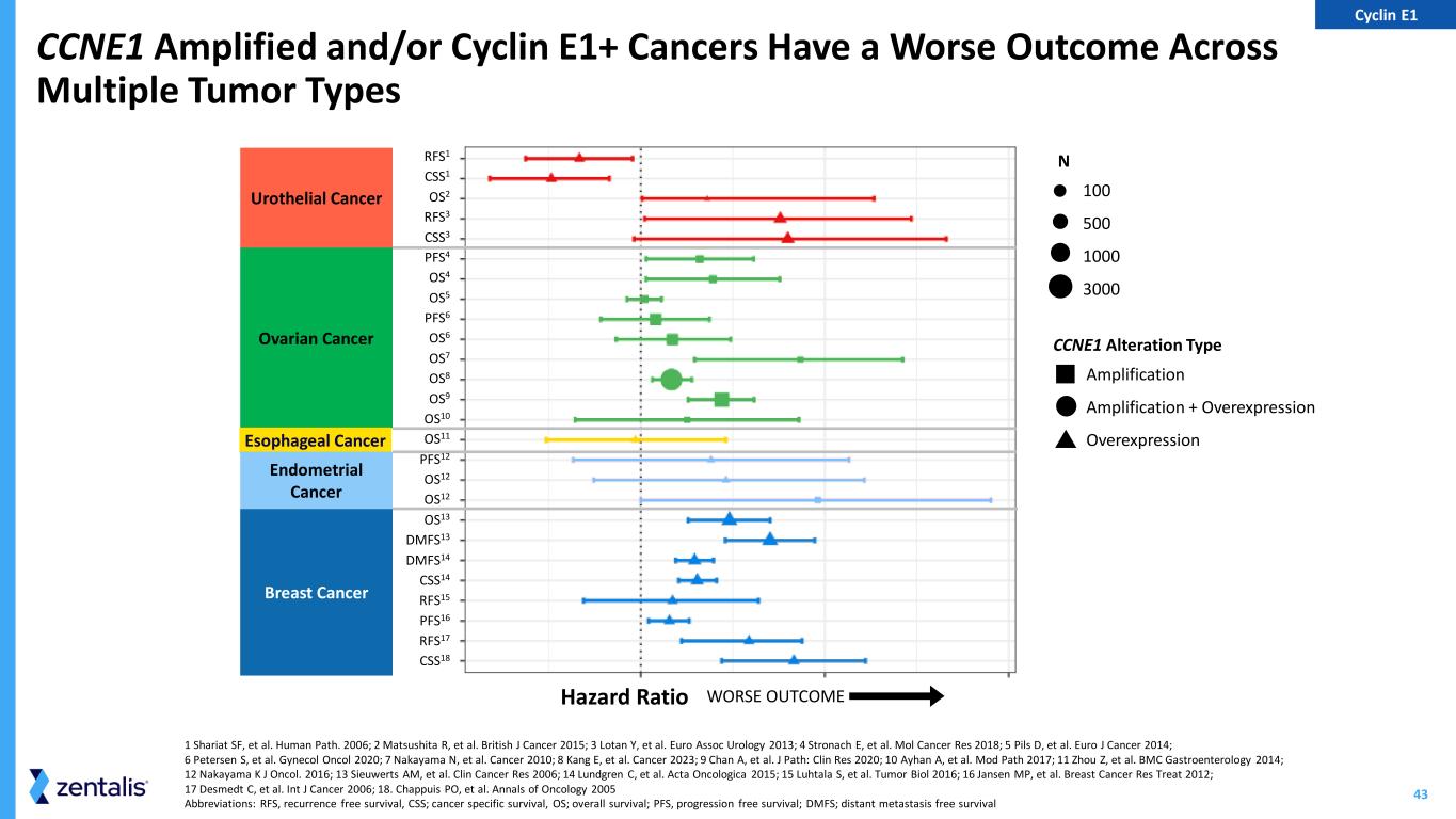 42 Cyclin E1 Amplification Particularly Prevalent in Gynecologic Malignancies But Occurs in Many Other Tumor Types TCGA Pan Cancer Analysis (6547 samples)1 Frequency of CCNE1 Amplification Across Tumor Types2 0 5 10 15 20 25 Frequency of Amplification (%) Ovarian Serous Bladder Urothelial Stomach Adenocarcinoma Uterine Corpus Endometrioid Lung Squamous Cell All Lung Cancers All Epithelial Cancers Breast Invasive Lung Adenocarcinoma Colorectal Colon Adenocarcinoma Glioblastoma Multiforme 21% 20% 11% 8% 6% 6% 6% 5% 3% 3% 3% 3% 3% 2% Ovarian Cancer Gastric/Stomach Breast Cholangiocarcinoma/Gall Bladder Endometrial/Uterine Lung Other Pancreatic Cervical Colorectal Sarcoma Prostate Fallopian Tube Carcinoma Bladder Cyclin E1 1 Etemadmoghadam D., et al. Proc Natl Acad Sci USA 2013; 2 Yao, S., et al. Sci Rep 12, 8701 2022. 3. TCGA GENIE: 2161/119807 (1.8%). 4. Foundation Insights database: 18802/541919 (3.5%)