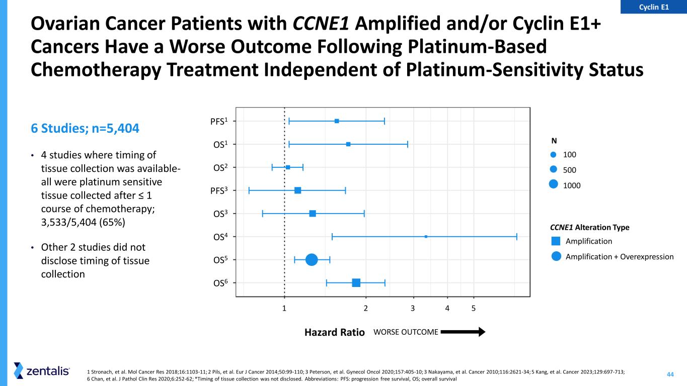43 1 Shariat SF, et al. Human Path. 2006; 2 Matsushita R, et al. British J Cancer 2015; 3 Lotan Y, et al. Euro Assoc Urology 2013; 4 Stronach E, et al. Mol Cancer Res 2018; 5 Pils D, et al. Euro J Cancer 2014; 6 Petersen S, et al. Gynecol Oncol 2020; 7 Nakayama N, et al. Cancer 2010; 8 Kang E, et al. Cancer 2023; 9 Chan A, et al. J Path: Clin Res 2020; 10 Ayhan A, et al. Mod Path 2017; 11 Zhou Z, et al. BMC Gastroenterology 2014; 12 Nakayama K J Oncol. 2016; 13 Sieuwerts AM, et al. Clin Cancer Res 2006; 14 Lundgren C, et al. Acta Oncologica 2015; 15 Luhtala S, et al. Tumor Biol 2016; 16 Jansen MP, et al. Breast Cancer Res Treat 2012; 17 Desmedt C, et al. Int J Cancer 2006; 18. Chappuis PO, et al. Annals of Oncology 2005 Abbreviations: RFS, recurrence free survival, CSS; cancer specific survival, OS; overall survival; PFS, progression free survival; DMFS; distant metastasis free survival CCNE1 Amplified and/or Cyclin E1+ Cancers Have a Worse Outcome Across Multiple Tumor Types N 100 500 1000 3000 Hazard Ratio WORSE OUTCOME CCNE1 Alteration Type Amplification Amplification + Overexpression Overexpression RFS1 CSS1 OS2 RFS3 CSS3 PFS4 OS4 OS5 PFS6 OS6 OS7 OS8 OS9 OS10 OS11 PFS12 OS12 OS12 OS13 DMFS13 DMFS14 CSS14 RFS15 PFS16 RFS17 CSS18 Urothelial Cancer Ovarian Cancer Breast Cancer Esophageal Cancer Endometrial Cancer Cyclin E1