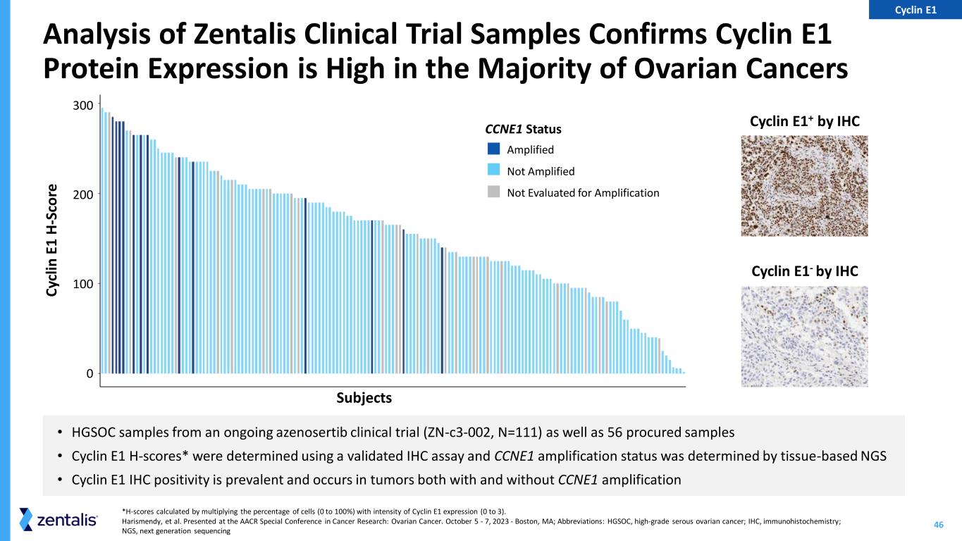 45H-scores calculated by multiplying the percentage of cells (0 to 100%) with intensity of Cyclin E1 expression (0 to 3); Liu JF., et al. Journal of Clinical Oncology 41, no. 16_suppl (June 01, 2023) 5513-5513; Abbreviations: CI, confidence interval; PFS, progression free survival Progression Free Survival Triples in Patients with Cyclin E1+ Tumors Compared to Cyclin E1- Tumors in Azenosertib Chemotherapy Combinations (ZN-c3-002) 0 0.0 0.2 0.4 0.6 0.8 1.0 5 10 15 20 25 P ro gr e ss io n -F re e Su rv iv al P ro b ab ili ty Time (months) Patients at Risk 78 12 36 2 12 1 4 1 1 0 H-Score > 50 H-Score ≤ 50 (N=12) (N=78) Median PFS (months) 3.25 9.86 Hazard Ratio (95% CI) 0.37 (0.18 – 0.79) Log-rank p-value 0.0078 H-Score ≤ 50 H-Score > 50 Cyclin E1