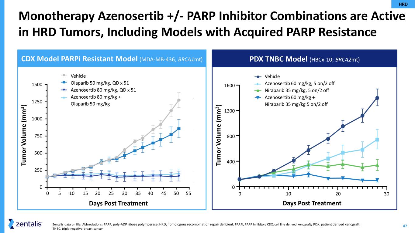 46 *H-scores calculated by multiplying the percentage of cells (0 to 100%) with intensity of Cyclin E1 expression (0 to 3). Harismendy, et al. Presented at the AACR Special Conference in Cancer Research: Ovarian Cancer. October 5 - 7, 2023 - Boston, MA; Abbreviations: HGSOC, high-grade serous ovarian cancer; IHC, immunohistochemistry; NGS, next generation sequencing Analysis of Zentalis Clinical Trial Samples Confirms Cyclin E1 Protein Expression is High in the Majority of Ovarian Cancers • HGSOC samples from an ongoing azenosertib clinical trial (ZN-c3-002, N=111) as well as 56 procured samples • Cyclin E1 H-scores* were determined using a validated IHC assay and CCNE1 amplification status was determined by tissue-based NGS • Cyclin E1 IHC positivity is prevalent and occurs in tumors both with and without CCNE1 amplification Cyclin E1+ by IHC Cyclin E1- by IHC Subjects C yc lin E 1 H -S co re 300 200 100 0 CCNE1 Status Amplified Not Amplified Not Evaluated for Amplification Cyclin E1