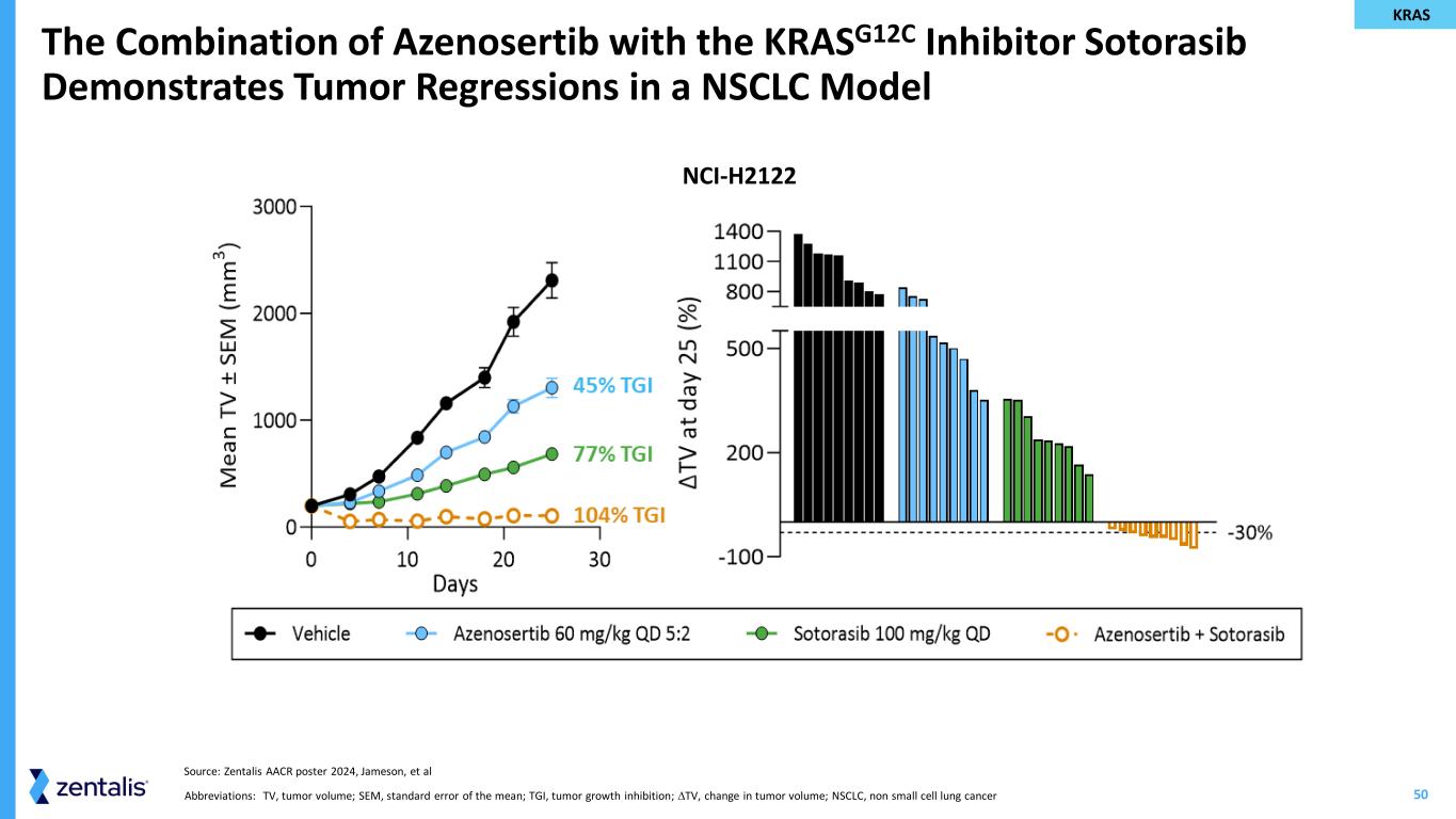 50 The Combination of Azenosertib with the KRASG12C Inhibitor Sotorasib Demonstrates Tumor Regressions in a NSCLC Model Source: Zentalis AACR poster 2024, Jameson, et al Abbreviations: TV, tumor volume; SEM, standard error of the mean; TGI, tumor growth inhibition; TV, change in tumor volume; NSCLC, non small cell lung cancer KRAS NCI-H2122