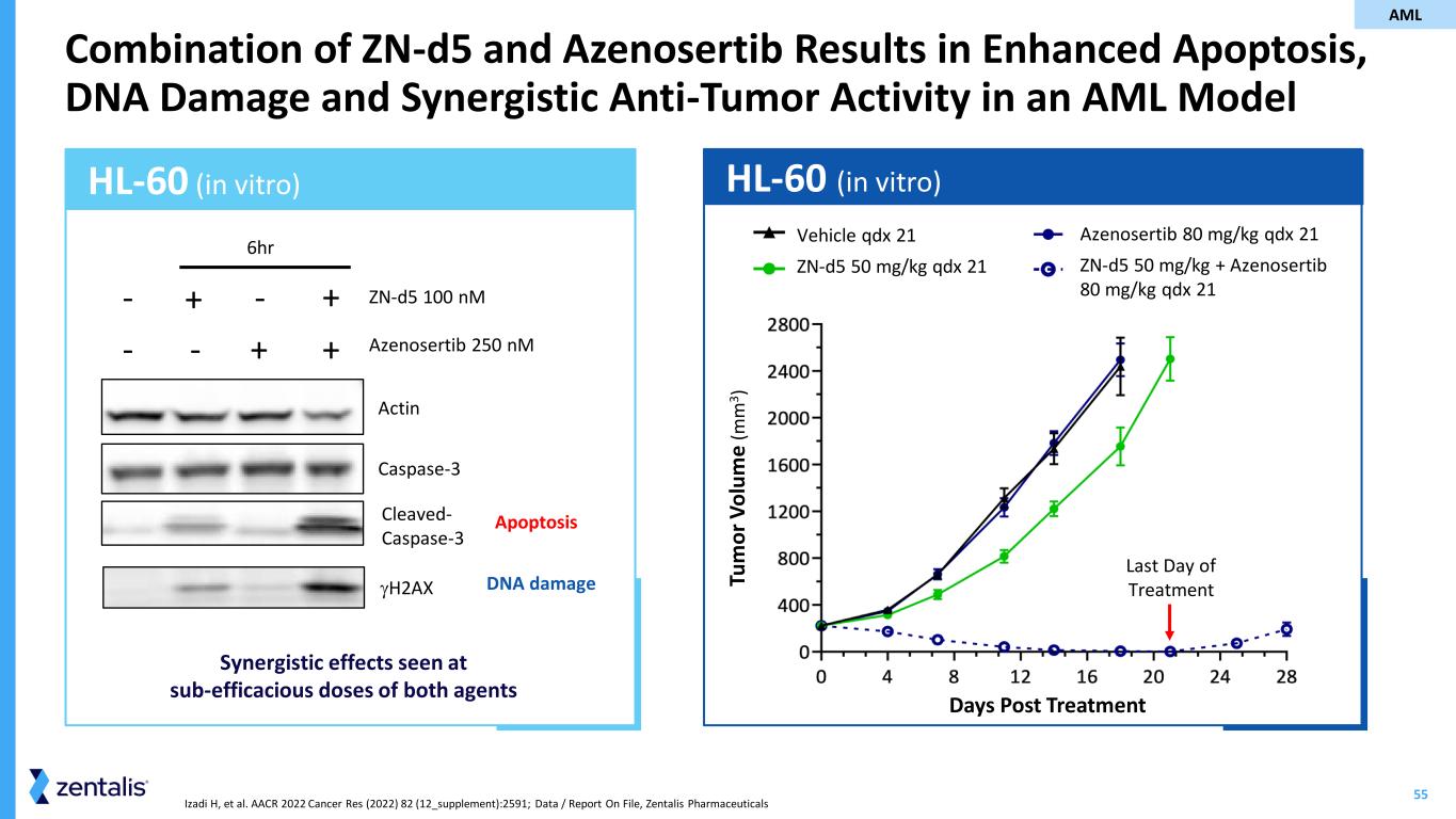 55 HL-60 (in vitro)HL-60 (in vitro) Izadi H, et al. AACR 2022 Cancer Res (2022) 82 (12_supplement):2591; Data / Report On File, Zentalis Pharmaceuticals Combination of ZN-d5 and Azenosertib Results in Enhanced Apoptosis, DNA Damage and Synergistic Anti-Tumor Activity in an AML Model - - + - + - + + 6hr Cleaved- Caspase-3 ZN-d5 100 nM Azenosertib 250 nM Caspase-3 Actin H2AX Apoptosis DNA damage Synergistic effects seen at sub-efficacious doses of both agents Days Post Treatment Tu m o r V o lu m e (m m 3 ) Vehicle qdx 21 ZN-d5 50 mg/kg qdx 21 Azenosertib 80 mg/kg qdx 21 ZN-d5 50 mg/kg + Azenosertib 80 mg/kg qdx 21 Last Day of Treatment AML