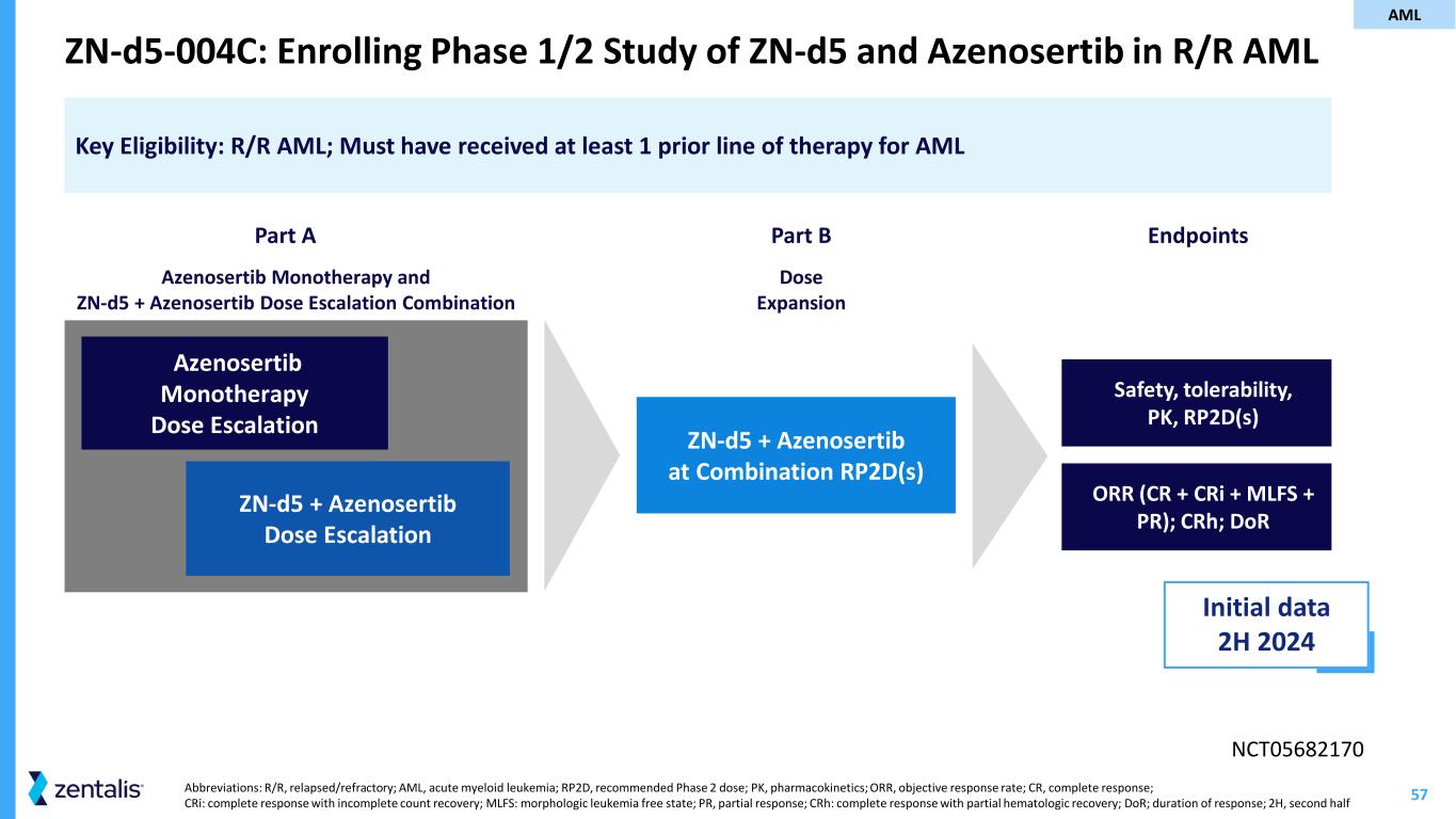 57 ZN-d5-004C: Enrolling Phase 1/2 Study of ZN-d5 and Azenosertib in R/R AML Abbreviations: R/R, relapsed/refractory; AML, acute myeloid leukemia; RP2D, recommended Phase 2 dose; PK, pharmacokinetics; ORR, objective response rate; CR, complete response; CRi: complete response with incomplete count recovery; MLFS: morphologic leukemia free state; PR, partial response; CRh: complete response with partial hematologic recovery; DoR; duration of response; 2H, second half Key Eligibility: R/R AML; Must have received at least 1 prior line of therapy for AML NCT05682170 ZN-d5 + Azenosertib Dose Escalation Azenosertib Monotherapy Dose Escalation ZN-d5 + Azenosertib at Combination RP2D(s) Safety, tolerability, PK, RP2D(s) Azenosertib Monotherapy and ZN-d5 + Azenosertib Dose Escalation Combination Part A Dose Expansion Part B Endpoints ORR (CR + CRi + MLFS + PR); CRh; DoR Initial data 2H 2024 AML