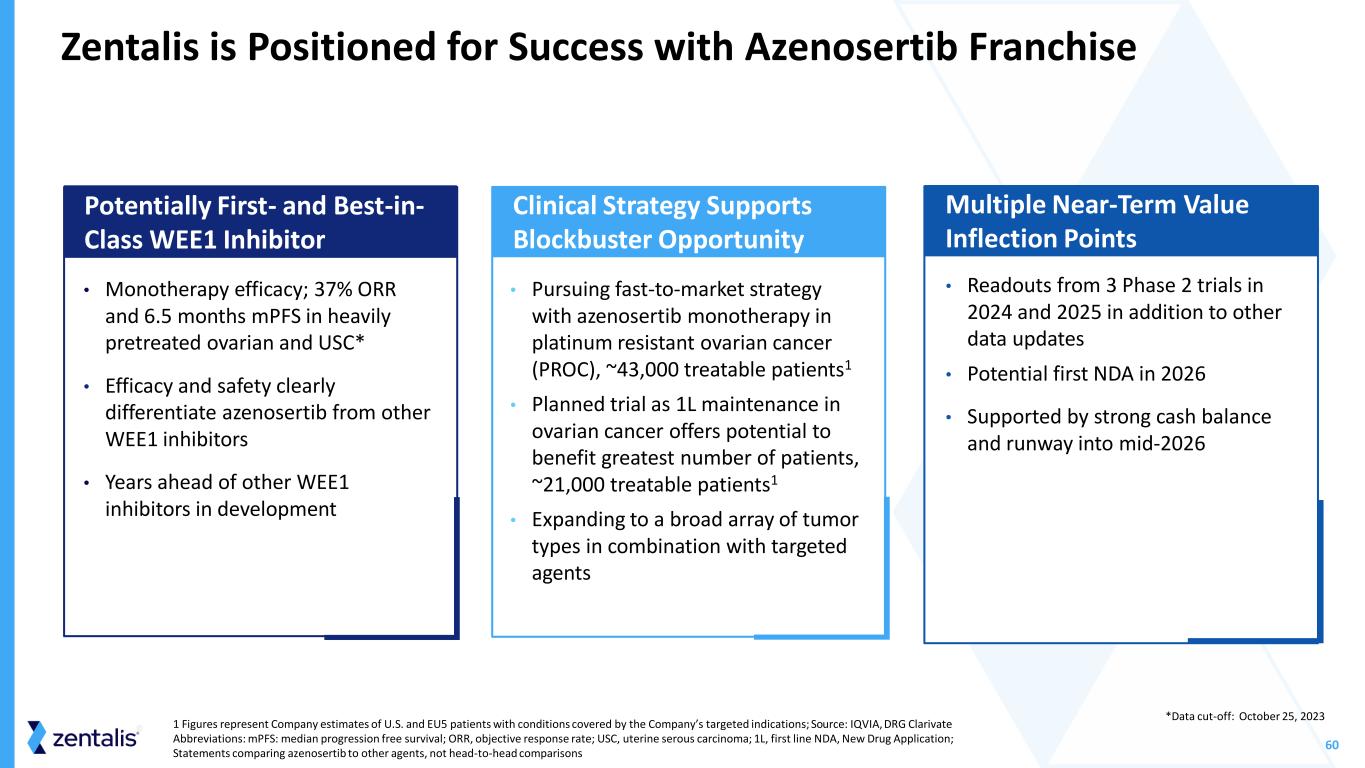 59 Initial data from Phase 1 azenosertib + BEACON regimen trial in BRAF mutant mCRC with Pfizer (ZN-c3-016) Topline data from niraparib + azenosertib cohorts in Phase 2 trial in post-PARPi PROC (MAMMOTH, ZN-c3-006) Initial data from Phase 1 azenosertib + ZN-d5 trial in R/R AML (ZN-d5-004C) 2H Abbreviations: 1H, first half; 2H second half; BRAF,V-Raf murine sarcoma viral oncogene homolog B; mCRC, metastatic colorectal cancer; PARPi, poly-ADP ribose polymerase inhibitor; R/R AML, relapsed or refractory acute myeloid leukemia; PROC, platinum resistant ovarian cancer; USC, uterine serous carcinoma; PSOC, platinum sensitive ovarian cancer; 1L, first line Upcoming Clinical Milestones Monotherapy Combinations 2H Final results of Phase 1b azenosertib monotherapy trial in solid tumors (ZN-c3-001) Topline data from Phase 2 azenosertib monotherapy trial in PROC (DENALI, ZN-c3-005) 1H Topline data from Phase 2 azenosertib monotherapy trial in USC (TETON, ZN-c3-004) 2H 2025 Final results of Phase 1 azenosertib + gemcitabine trial in osteosarcoma (ZN-c3-003) 1H Initiate clinical trial in PSOC in 1L maintenance setting Topline data from monotherapy cohort in Phase 2 trial in post-PARPi PROC (MAMMOTH, ZN-c3-006) 2024