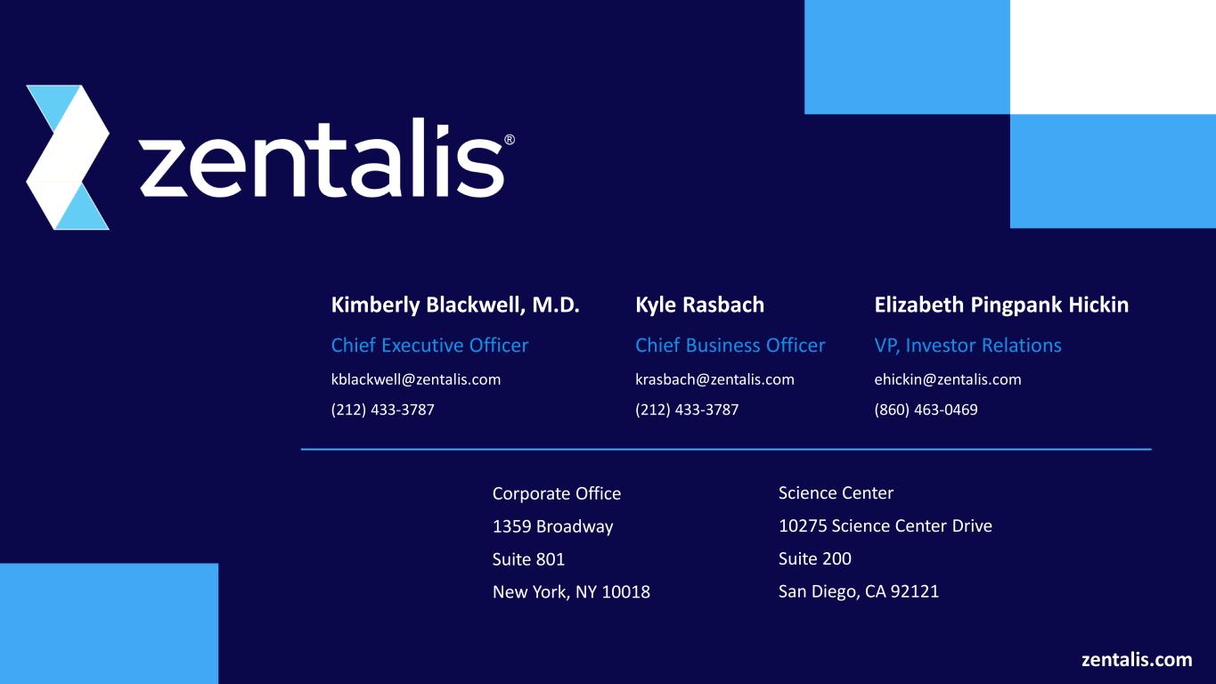zentalis.com Kyle Rasbach Chief Business Officer krasbach@zentalis.com (212) 433-3787 Corporate Office 1359 Broadway Suite 801 New York, NY 10018 Science Center 10275 Science Center Drive Suite 200 San Diego, CA 92121 Kimberly Blackwell, M.D. Chief Executive Officer kblackwell@zentalis.com (212) 433-3787 Elizabeth Pingpank Hickin VP, Investor Relations ehickin@zentalis.com (860) 463-0469