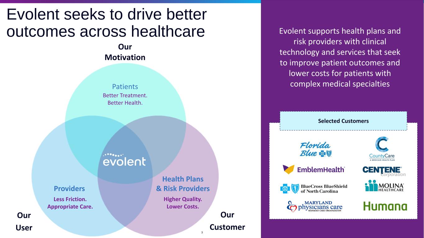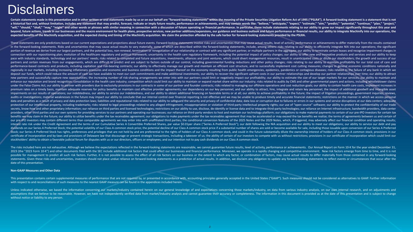 Disclaimers 2 Certain statements made in this presentation and in other written or oral statements made by us or on our behalf are “forward-looking statements” within the meaning of the Private Securities Litigation Reform Act of 1995 (“PSLRA”). A forward-looking statement is a statement that is not a historical fact and, without limitation, includes any statement that may predict, forecast, indicate or imply future results, performance or achievements, and may contain words like: “believe,” “anticipate,” “expect,” “estimate,” “aim,” “predict,” “potential,” “continue,” “plan,” “project,” “will,” “should,” “shall,” “may,” “might” and other words or phrases with similar meaning in connection with a discussion of future operating or financial performance. In particular, these include statements relating to our ability to grow our impact significantly throughout this year and beyond, future actions, trends in our businesses and the macro environment for health plans, prospective services, new partner additions/expansions, our guidance and business outlook and future performance or financial results, our ability to integrate Machinify into our operations, the expected benefits of the Machinify acquisition, and the expected closing and timing of the Machinify acquisition. We claim the protection afforded by the safe harbor for forward-looking statements provided by the PSLRA. These statements are only predictions based on our current expectations and projections about future events. Forward-looking statements involve risks and uncertainties that may cause actual results, level of activity, performance or achievements to differ materially from the results contained in the forward-looking statements. Risks and uncertainties that may cause actual results to vary materially, some of which are described within the forward-looking statements, include, among others: risks relating to our ability to efficiently integrate NIA into our operations; the significant portion of revenue we derive from our largest partners, and the potential loss, non-renewal, termination or renegotiation of our relationship or contract with any significant partner, or multiple partners in the aggregate; our ability to terminate certain leases and recognize impairment charges in connection with our repositioning plan; evolution of the healthcare regulatory and political framework; uncertainty in the health care regulatory framework, including the potential impact of policy changes; our ability to offer new and innovative products and services and our ability to keep pace with industry standards, technology and our partners’ needs; risks related to completed and future acquisitions, investments, alliances and joint ventures, which could divert management resources, result in unanticipated costs or dilute our stockholders; the growth and success of our partners and certain revenues from our engagements, which are difficult to predict and are subject to factors outside of our control, including governmental funding reductions and other policy changes; risks relating to our ability to maintain profitability for our total cost of care and performance-based contracts and products, including capitation and risk-bearing contracts; our ability to effectively manage our growth and maintain an efficient cost structure, and to successfully implement cost cutting measures; changes in general economic conditions nationally and regionally in our markets, including increasing inflationary pressures and economic and business conditions and the impact thereof on the economy resulting from public health emergencies, epidemics, pandemics or contagious diseases; risks related to the failure of any bank in which we deposit our funds, which could reduce the amount of cash we have available to meet our cash commitments and make additional investments; our ability to recover the significant upfront costs in our partner relationships and develop our partner relationships over time; our ability to attract new partners and successfully capture new opportunities; the increasing number of risk-sharing arrangements we enter into with our partners could limit or negatively impact our profitability; our ability to estimate the size of our target markets for our services; our ability to maintain and enhance our reputation and brand recognition; consolidation in the health care industry; competition which could limit our ability to maintain or expand market share within our industry; risks related to audits by CMS and other governmental payers and actions, including whistleblower claims under the False Claims Act; our ability to partner with providers due to exclusivity provisions in our contracts in some of our partner and founder contracts; risks related to managing our offshore operations and cost reduction goals; our ability to contain health care costs, implement increases in premium rates on a timely basis, maintain adequate reserves for policy benefits or maintain cost effective provider agreements; our dependency on our key personnel, and our ability to attract, hire, integrate and retain key personnel; the impact of additional goodwill and intangible asset impairments on our results of operations; our indebtedness, our ability to service our indebtedness, and our ability to obtain additional financing on favorable terms or at all; our ability to achieve profitability in the future; the impact of litigation proceedings, government inquiries, reviews, audits or investigations; material weaknesses in the future may impact our ability to conclude that our internal control over financial reporting is not effective and we may be unable to produce timely and accurate financial statements; restrictions on the manner in which we access personal data and penalties as a result of privacy and data protection laws; liabilities and reputational risks related to our ability to safeguard the securi