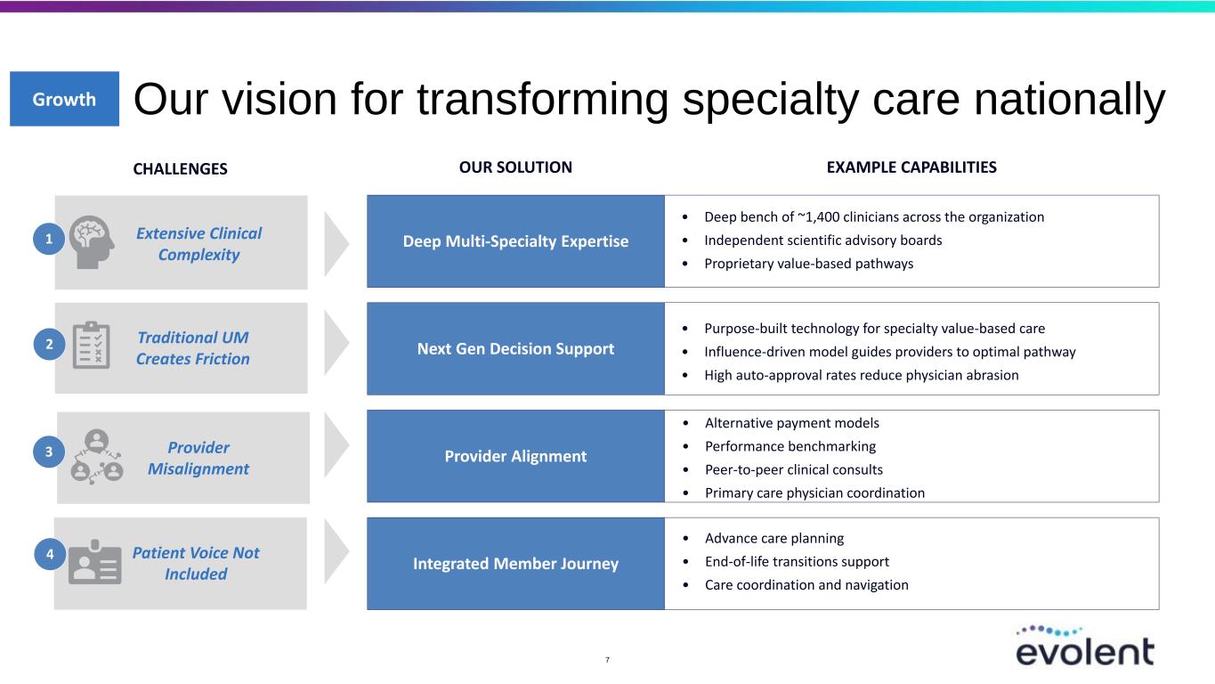 The opportunity in value-based specialty care Large Specialty TAM with Low Penetration Significant Customer Unmet Need Uneven Quality Spiraling Costs Broken Experience U.S. spend increased by >$50B for oncology, cardiology and MSK alone between 2015 and 20203 75% of low-value care comes from specialist physicians4 60% of Americans have said they have had a negative health care experience within the last three months5 $150B Total Specialty TAM1 $50B – Cross-Sell Opportunity2 ~$2.6B – Q1 ‘24 Annualized Revenue 1. Evolent Health internal estimates based on Evolent and total national health plan membership. 2. Evolent Health internal estimates based on Evolent and total membership of existing clients. 3. Health Care | U.S. Bureau of Economic Analysis (BEA) (2020). 4. Fogler, S. et al. (2021). Pathways for Specialty Care Coordination and Integration in Population-Based Models. 5. Gordon, D. (2022). 60% Of Americans Have Had A Recent Bad Health Care Experience, New Survey Shows. https://www.forbes.com/sites/debgordon/2022/11/28/60-of-americans-have-had-a-recent-bad-health care-experience-new-survey-shows/?sh=183c601b2adf. 6 Premium Headwinds Health plan customers facing challenging cycle of lower pricing, unfavorable risk adjustment changes, and membership dynamics → Specialty management is key remaining lever to drive performance
