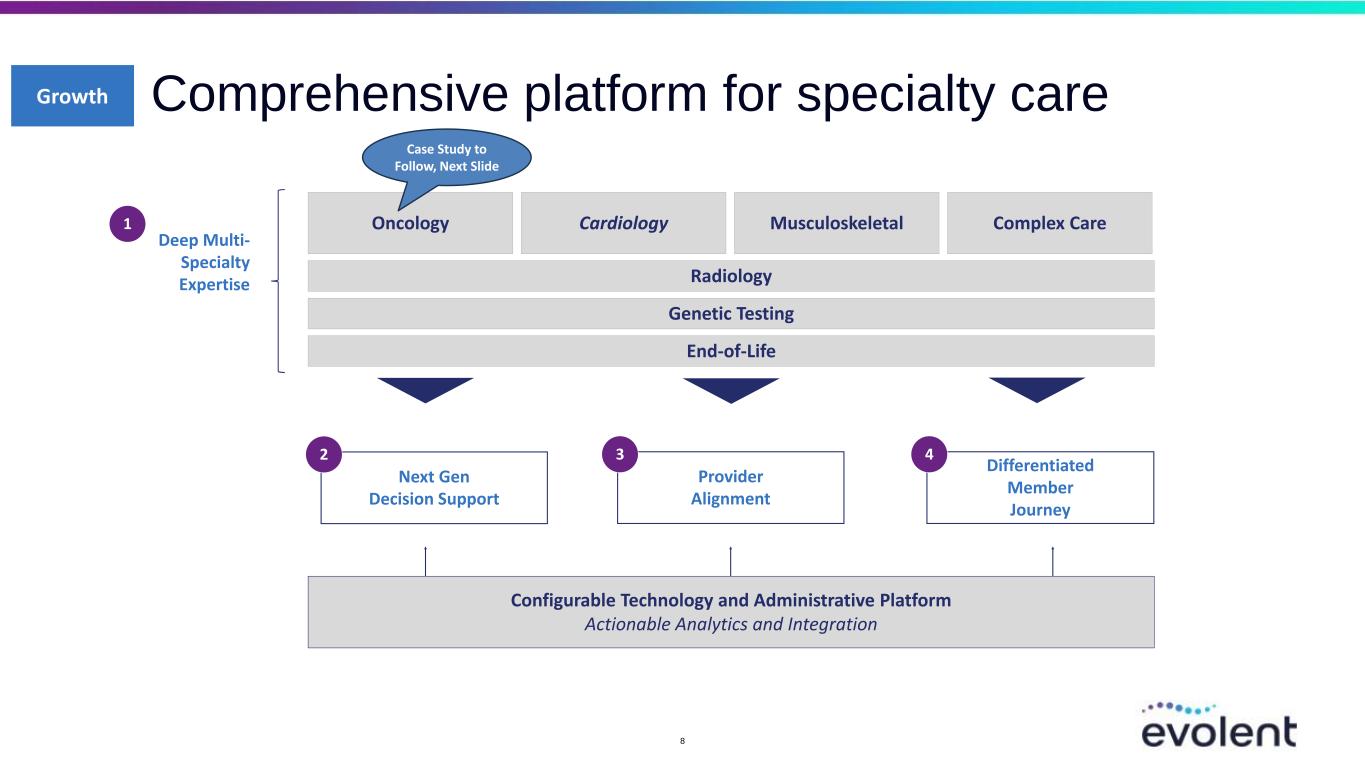 Our vision for transforming specialty care nationally Extensive Clinical Complexity Traditional UM Creates Friction Provider Misalignment Patient Voice Not Included 1 2 3 4 CHALLENGES OUR SOLUTION • Deep bench of ~1,400 clinicians across the organization • Independent scientific advisory boards • Proprietary value-based pathways Deep Multi-Specialty Expertise Next Gen Decision Support Provider Alignment Integrated Member Journey EXAMPLE CAPABILITIES • Purpose-built technology for specialty value-based care • Influence-driven model guides providers to optimal pathway • High auto-approval rates reduce physician abrasion • Alternative payment models • Performance benchmarking • Peer-to-peer clinical consults • Primary care physician coordination • Advance care planning • End-of-life transitions support • Care coordination and navigation 7