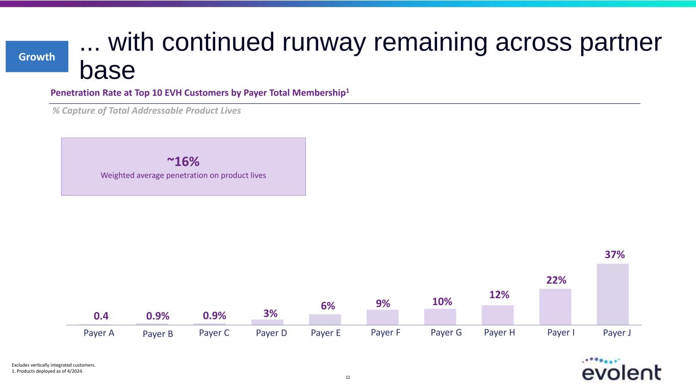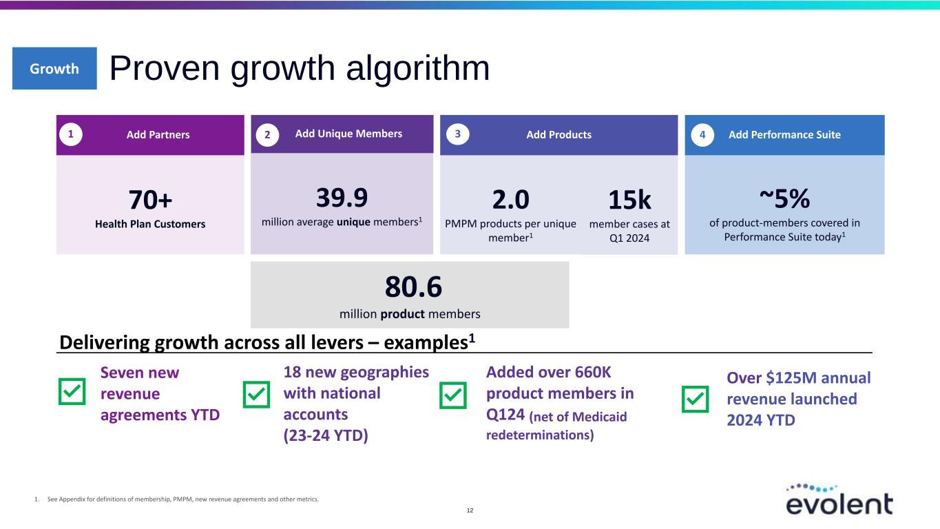 ... with continued runway remaining across partner base Penetration Rate at Top 10 EVH Customers by Payer Total Membership1 % Capture of Total Addressable Product Lives 11 Excludes vertically integrated customers. 1. Products deployed as of 4/2024. ~16% Weighted average penetration on product lives Payer A Payer D Payer HPayer B Payer E Payer GPayer C Payer I 0.4 0.9% 0.9% 3% 6% 9% 10% 12% 22% 37% Payer F Payer J