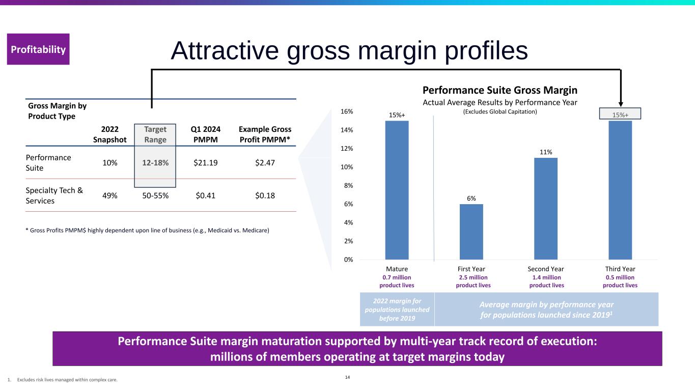 2022 margin for populations launched before 2019 Average margin by performance year for populations launched since 20191 Attractive gross margin profiles * Gross Profits PMPM$ highly dependent upon line of business (e.g., Medicaid vs. Medicare) Performance Suite margin maturation supported by multi-year track record of execution: millions of members operating at target margins today Gross Margin by Product Type 2022 Snapshot Target Range Q1 2024 PMPM Example Gross Profit PMPM* Performance Suite 10% 12-18% $21.19 $2.47 Specialty Tech & Services 49% 50-55% $0.41 $0.18 15%+ 6% 11% 15%+ 0% 2% 4% 6% 8% 10% 12% 14% 16% Mature First Year Second Year Third Year Performance Suite Gross Margin Actual Average Results by Performance Year (Excludes Global Capitation) 0.7 million product lives 2.5 million product lives 1.4 million product lives 0.5 million product lives 1. Excludes risk lives managed within complex care. 14 Profitability