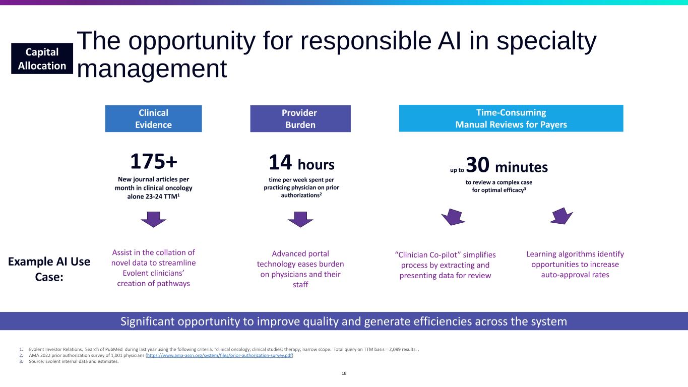 Evolent believes the addition of scalable AI technology will enable the Company to leapfrog standard industry processes by increasing the number of first-pass approvals as well as streamlining manual data collection and analysis associated with complex medical decision making. Such manual transactions can be time intensive and require clinical staff to read, search, identify, and synthesize key data from extensive medical record histories during case reviews. The solution to be acquired, Machinify Auth, functions as a co-pilot for nurses and doctors and brings a proven track record of reducing clinician workforce time by an average of 55% for complex, manual reviews for a large national payer customer and its provider network. With this capability, Evolent clinicians will be able to spend more time guiding providers to higher-value choices, strengthening the Company’s core value proposition of higher quality outcomes and cost savings, while also reducing administrative burden for providers and members.