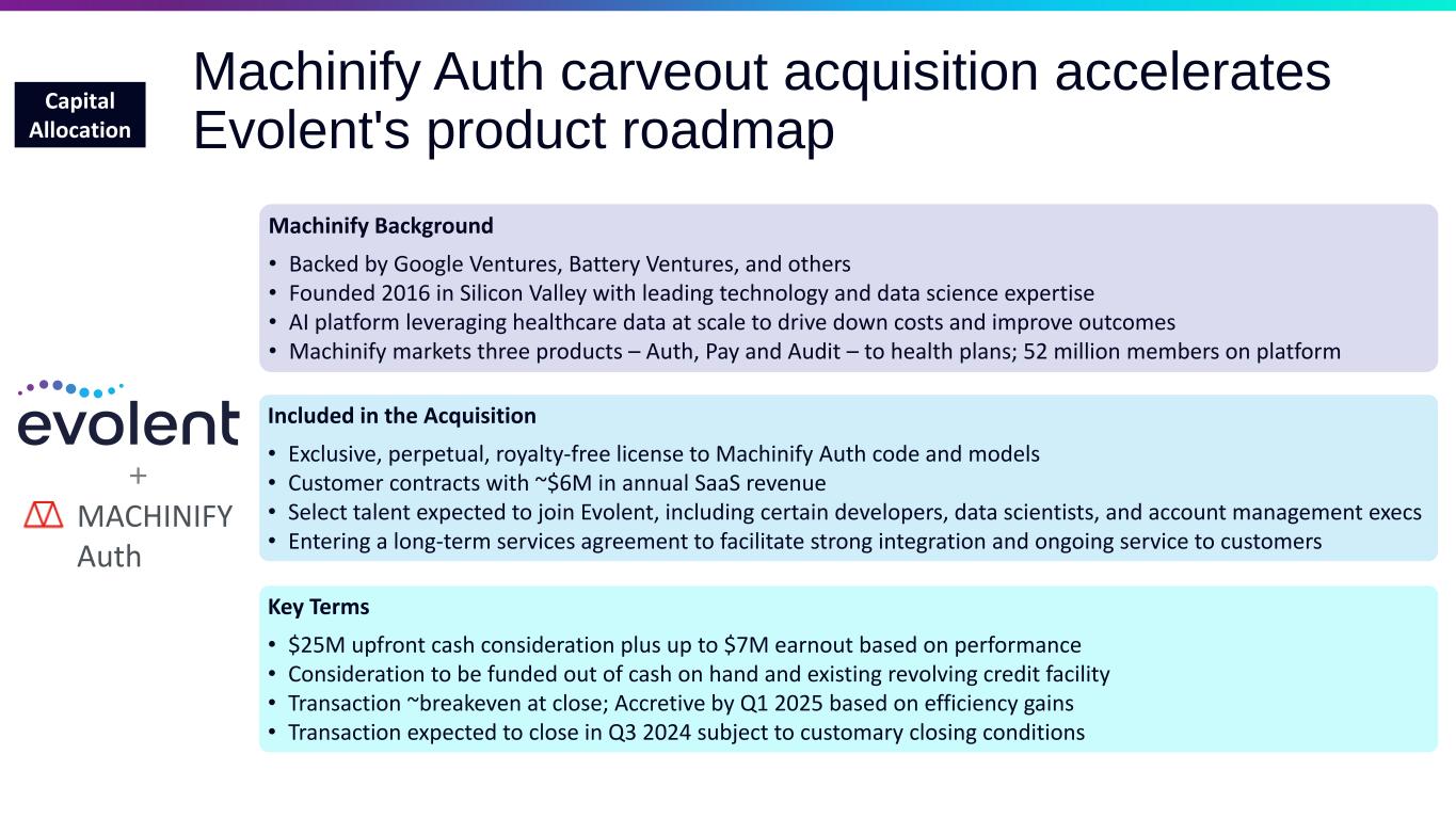 Machinify Auth carveout acquisition accelerates Evolent's product roadmap Machinify Background • Backed by Google Ventures, Battery Ventures, and others • Founded 2016 in Silicon Valley with leading technology and data science expertise • AI platform leveraging healthcare data at scale to drive down costs and improve outcomes • Machinify markets three products – Auth, Pay and Audit – to health plans; 52 million members on platform Key Terms • $25M upfront cash consideration plus up to $7M earnout based on performance • Consideration to be funded out of cash on hand and existing revolving credit facility • Transaction ~breakeven at close; Accretive by Q1 2025 based on efficiency gains • Transaction expected to close in Q3 2024 subject to customary closing conditions Included in the Acquisition • Exclusive, perpetual, royalty-free license to Machinify Auth code and models • Customer contracts with ~$6M in annual SaaS revenue • Select talent expected to join Evolent, including certain developers, data scientists, and account management execs • Entering a long-term services agreement to facilitate strong integration and ongoing service to customers + MACHINIFY Auth Capital Allocation