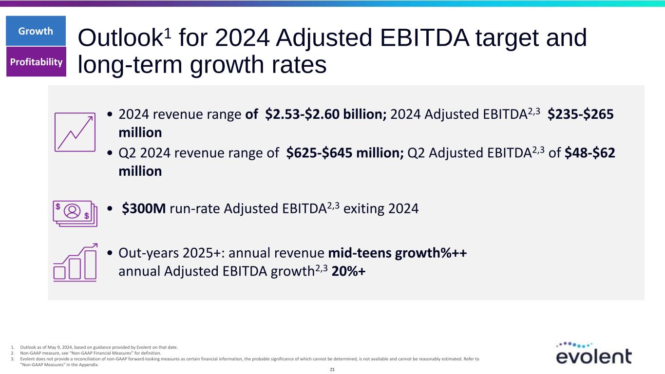 Machinify is a privately held company based in Palo Alto, California. Upon closing, Evolent will be acquiring certain assets and the exclusive license to the Machinify Auth platform. In addition, certain employees of Machinify will be re-badged as Evolent employees upon closing. Lastly, Machinify and Evolent expect to enter into a long-term services agreement at closing to support the development and integration of the platform with Evolent. The acquisition is immaterial to Evolent’s revenue outlook and is estimated to be neutral to Adjusted EBITDA in the first year after closing. This transaction is anticipated to close in the third quarter of 2024.
