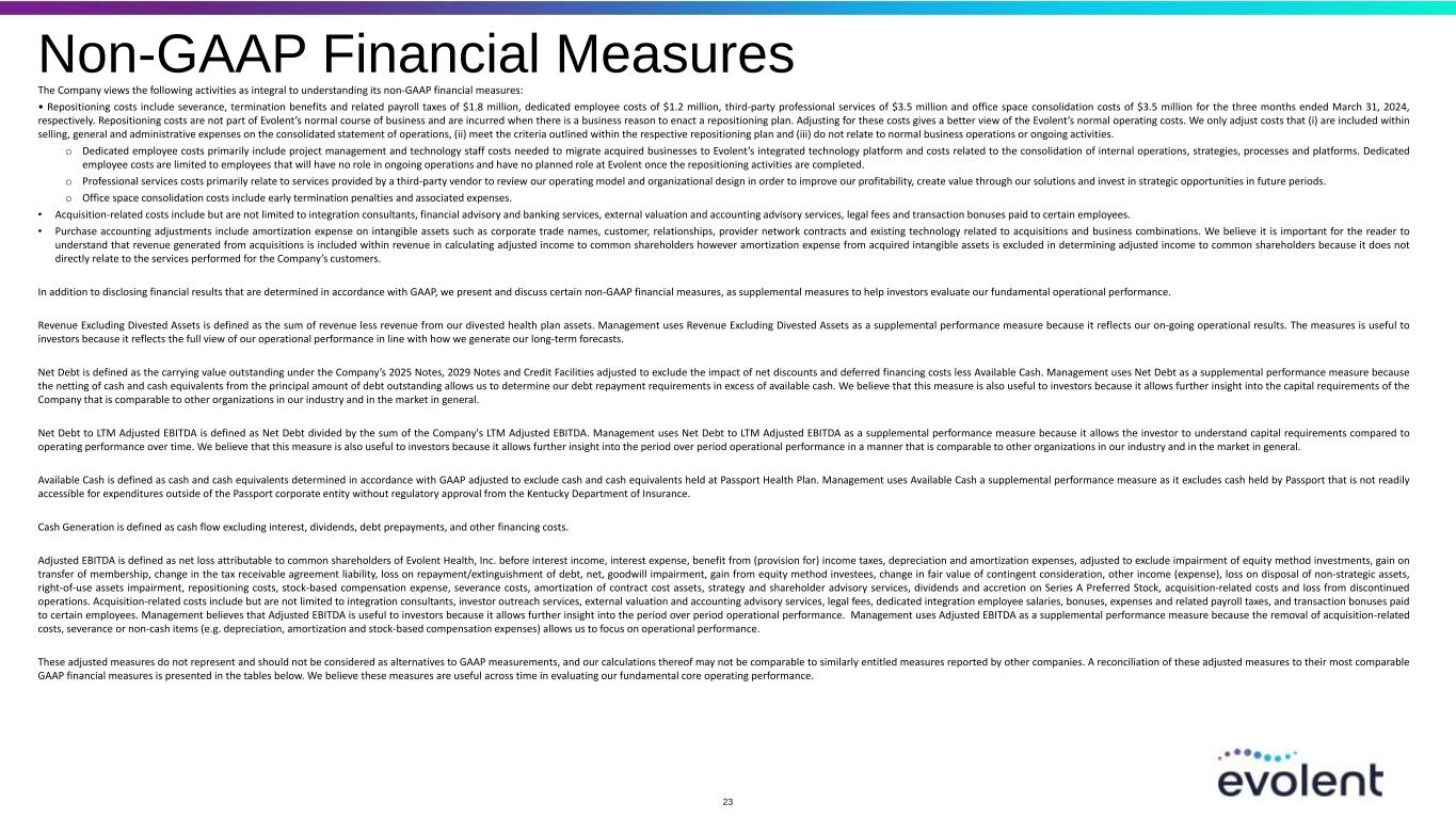 Non-GAAP Financial Measures The Company views the following activities as integral to understanding its non-GAAP financial measures: • Repositioning costs include severance, termination benefits and related payroll taxes of $1.8 million, dedicated employee costs of $1.2 million, third-party professional services of $3.5 million and office space consolidation costs of $3.5 million for the three months ended March 31, 2024, respectively. Repositioning costs are not part of Evolent’s normal course of business and are incurred when there is a business reason to enact a repositioning plan. Adjusting for these costs gives a better view of the Evolent’s normal operating costs. We only adjust costs that (i) are included within selling, general and administrative expenses on the consolidated statement of operations, (ii) meet the criteria outlined within the respective repositioning plan and (iii) do not relate to normal business operations or ongoing activities. o Dedicated employee costs primarily include project management and technology staff costs needed to migrate acquired businesses to Evolent’s integrated technology platform and costs related to the consolidation of internal operations, strategies, processes and platforms. Dedicated employee costs are limited to employees that will have no role in ongoing operations and have no planned role at Evolent once the repositioning activities are completed. o Professional services costs primarily relate to services provided by a third-party vendor to review our operating model and organizational design in order to improve our profitability, create value through our solutions and invest in strategic opportunities in future periods. o Office space consolidation costs include early termination penalties and associated expenses. • Acquisition-related costs include but are not limited to integration consultants, financial advisory and banking services, external valuation and accounting advisory services, legal fees and transaction bonuses paid to certain employees. • Purchase accounting adjustments include amortization expense on intangible assets such as corporate trade names, customer, relationships, provider network contracts and existing technology related to acquisitions and business combinations. We believe it is important for the reader to understand that revenue generated from acquisitions is included within revenue in calculating adjusted income to common shareholders however amortization expense from acquired intangible assets is excluded in determining adjusted income to common shareholders because it does not directly relate to the services performed for the Company’s customers. In addition to disclosing financial results that are determined in accordance with GAAP, we present and discuss certain non-GAAP financial measures, as supplemental measures to help investors evaluate our fundamental operational performance. Revenue Excluding Divested Assets is defined as the sum of revenue less revenue from our divested health plan assets. Management uses Revenue Excluding Divested Assets as a supplemental performance measure because it reflects our on-going operational results. The measures is useful to investors because it reflects the full view of our operational performance in line with how we generate our long-term forecasts. Net Debt is defined as the carrying value outstanding under the Company’s 2025 Notes, 2029 Notes and Credit Facilities adjusted to exclude the impact of net discounts and deferred financing costs less Available Cash. Management uses Net Debt as a supplemental performance measure because the netting of cash and cash equivalents from the principal amount of debt outstanding allows us to determine our debt repayment requirements in excess of available cash. We believe that this measure is also useful to investors because it allows further insight into the capital requirements of the Company that is comparable to other organizations in our industry and in the market in general. Net Debt to LTM Adjusted EBITDA is defined as Net Debt divided by the sum of the Company's LTM Adjusted EBITDA. Management uses Net Debt to LTM Adjusted EBITDA as a supplemental performance measure because it allows the investor to understand capital requirements compared to operating performance over time. We believe that this measure is also useful to investors because it allows further insight into the period over period operational performance in a manner that is comparable to other organizations in our industry and in the market in general. Available Cash is defined as cash and cash equivalents determined in accordance with GAAP adjusted to exclude cash and cash equivalents held at Passport Health Plan. Management uses Available Cash a supplemental performance measure as it excludes cash held by Passport that is not readily accessible for expenditures outside of the Passport corporate entity without regulatory approval from the Kentucky Department of Insurance. Cash Generation is defined as cash flow excluding interest, dividends, debt prepayments, and other financing costs. Adjusted EBITDA is defined as net loss attributable to common shareholders of Evolent Health, Inc. before interest income, interest expense, benefit from (provision for) income taxes, depreciation and amortization expenses, adjusted to exclude impairment of equity method investments, gain on transfer of membership, change in the tax receivable agreement liability, loss on repayment/extinguishment of debt, net, goodwill impairment, gain from equity method investees, change in fair value of contingent consideration, other income (expense), loss on disposal of non-strategic assets, right-of-use assets impairment, repositioning costs, stock-based compensation expense, severance costs, amortization of contract cost assets, strategy and shareholder advisory services, dividends and accretion on Series A Preferred Stock, acquisition-related costs and loss from discont