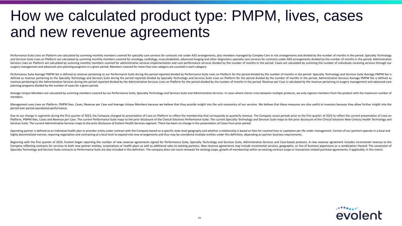 How we calculated product type: PMPM, lives, cases and new revenue agreements Performance Suite Lives on Platform are calculated by summing monthly members covered for specialty care services for contracts not under ASO arrangements, plus members managed by Complex Care in risk arrangements and divided by the number of months in the period. Specialty Technology and Services Suite Lives on Platform are calculated by summing monthly members covered for oncology, cardiology, musculoskeletal, advanced imaging and other diagnostics specialty care services for contracts under ASO arrangements divided by the number of months in the period. Administrative Services Lives on Platform are calculated by summing monthly members covered for administrative services implementation and core performance services divided by the number of months in the period. Cases are calculated by summing the number of individuals receiving services through our surgery management and advanced care planning programs in a given period. Members covered for more than one category are counted in each category. Performance Suite Average PMPM fee is defined as revenue pertaining to our Performance Suite during the period reported divided by Performance Suite Lives on Platform for the period divided by the number of months in the period. Specialty Technology and Services Suite Average PMPM fee is defined as revenue pertaining to the Specialty Technology and Services Suite during the period reported divided by Specialty Technology and Services Suite Lives on Platform for the period divided by the number of months in the period. Administrative Services Average PMPM fee is defined as revenue pertaining to the Administrative Services during the period reported divided by the Administrative Services Lives on Platform for the period divided by the number of months in the period. Revenue per Case is calculated by the revenue pertaining to surgery management and advanced care planning programs divided by the number of cases for a given period. Average Unique Members are calculated by summing members covered by our Performance Suite, Specialty Technology and Services Suite and Administrative Services. In cases where clients cross between multiple products, we only capture members from the product with the maximum number of members. Management uses Lives on Platform, PMPM fees, Cases, Revenue per Case and Average Unique Members because we believe that they provide insight into the unit economics of our services. We believe that these measures are also useful to investors because they allow further insight into the period over period operational performance. Due to our change in segments during the first quarter of 2023, the Company changed its presentation of Lives on Platform to reflect the membership that corresponds to quarterly revenue. The Company recast periods prior to the first quarter of 2023 to reflect the current presentation of Lives on Platform, PMPM fees, Cases and Revenue per Case. The current Performance Suite maps to the prior disclosure of the Clinical Solutions Performance Suite. The current Specialty Technology and Services Suite maps to the prior disclosure of the Clinical Solutions New Century Health Technology and Services Suite. The current Administrative Services maps to the prior disclosure of Evolent Health Services segment. There has been no change in the presentation of Cases from prior period. Operating partner is defined as an individual health plan or provider entity under contract with the Company based on a specific state-level geography and whether a relationship is based on fees for covered lives or capitation per life under management. Certain of our partners operate in a local and highly decentralized manner, requiring negotiation and contracting at a local level to expand into new arrangements and thus may be considered multiple entities under this definition, depending on partner business requirements. Beginning with the first quarter of 2024, Evolent began reporting the number of new revenue agreements signed for Performance Suite, Specialty Technology and Services Suite, Administrative Services and Case-based products. A new revenue agreement includes incremental revenue to the Company reflecting contracts for services to both new partner entities, corporations or health plans as well as additional sales to existing partners. New revenue agreements may include incremental services, geographic, or line of business expansions or a combination thereof. The conversion of Specialty Technology and Services Suite contracts to Performance Suite are also included in this definition. The company does not count renewals for existing scope, growth of membership within an existing contract scope or transaction related purchase agreements, if applicable, in this metric. 24