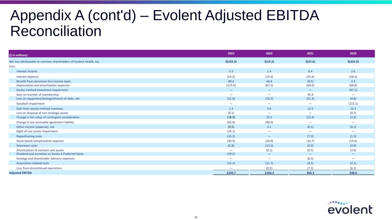 Appendix A (cont'd) – Evolent Adjusted EBITDA Reconciliation ($ in millions) 2023 2022 2021 2020 Net loss attributable to common shareholders of Evolent Health, Inc. $(142.3) $(19.2) $(37.6) $(334.2) Less: Interest income 5.3 1.4 0.4 2.6 Interest expense (54.2) (15.6) (25.4) (28.3) Benefit from (provision for) income taxes 89.4 43.4 (0.5) 2.4 Depreciation and amortization expenses (123.4) (67.2) (60.0) (60.8) Equity method investment impairment — — — (47.1) Gain on transfer of membership — — 45.9 — Loss on repayment/extinguishment of debt, net (21.0) (10.2) (21.3) (4.8) Goodwill impairment — — — (215.1) Gain from equity method investees 1.3 4.6 13.2 10.3 Loss on disposal of non-strategic assets (8.1) — — (0.7) Change in fair value of contingent consideration (18.0) 23.5 (13.3) (3.9) Change in tax receivable agreement liability (62.0) (46.0) — — Other income (expense), net (0.5) 0.1 (0.1) (0.1) Right-of-use assets impairment (24.1) — — — Repositioning costs (35.2) — (7.3) (1.3) Stock-based compensation expense (40.5) (34.0) (16.7) (14.6) Severance costs (1.5) (13.3) (0.2) (9.0) Amortization of contract cost assets — (0.1) (0.5) (3.9) Dividend and accretion on Series A Preferred Stock (29.2) — — — Strategy and shareholder advisory expenses — — (6.5) — Acquisition-related costs (15.1) (11.7) (4.2) (2.1) Loss from discontinued operations — (0.5) (7.3) (6.1) Adjusted EBITDA $194.7 $106.3 $66.3 $48.6 26