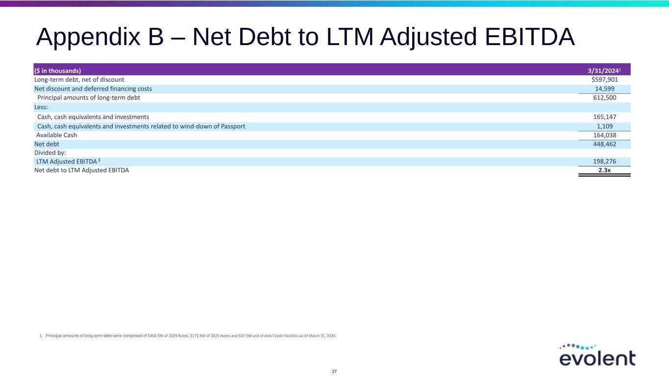 Appendix B – Net Debt to LTM Adjusted EBITDA 1. Principal amounts of long-term debt were comprised of $402.5M of 2029 Notes, $172.5M of 2025 Notes and $37.5M and of Ares Credit Facilities as of March 31, 2024. ($ in thousands) 3/31/20241 Long-term debt, net of discount $597,901 Net discount and deferred financing costs 14,599 Principal amounts of long-term debt 612,500 Less: Cash, cash equivalents and investments 165,147 Cash, cash equivalents and investments related to wind-down of Passport 1,109 Available Cash 164,038 Net debt 448,462 Divided by: LTM Adjusted EBITDA 3 198,276 Net debt to LTM Adjusted EBITDA 2.3x 27