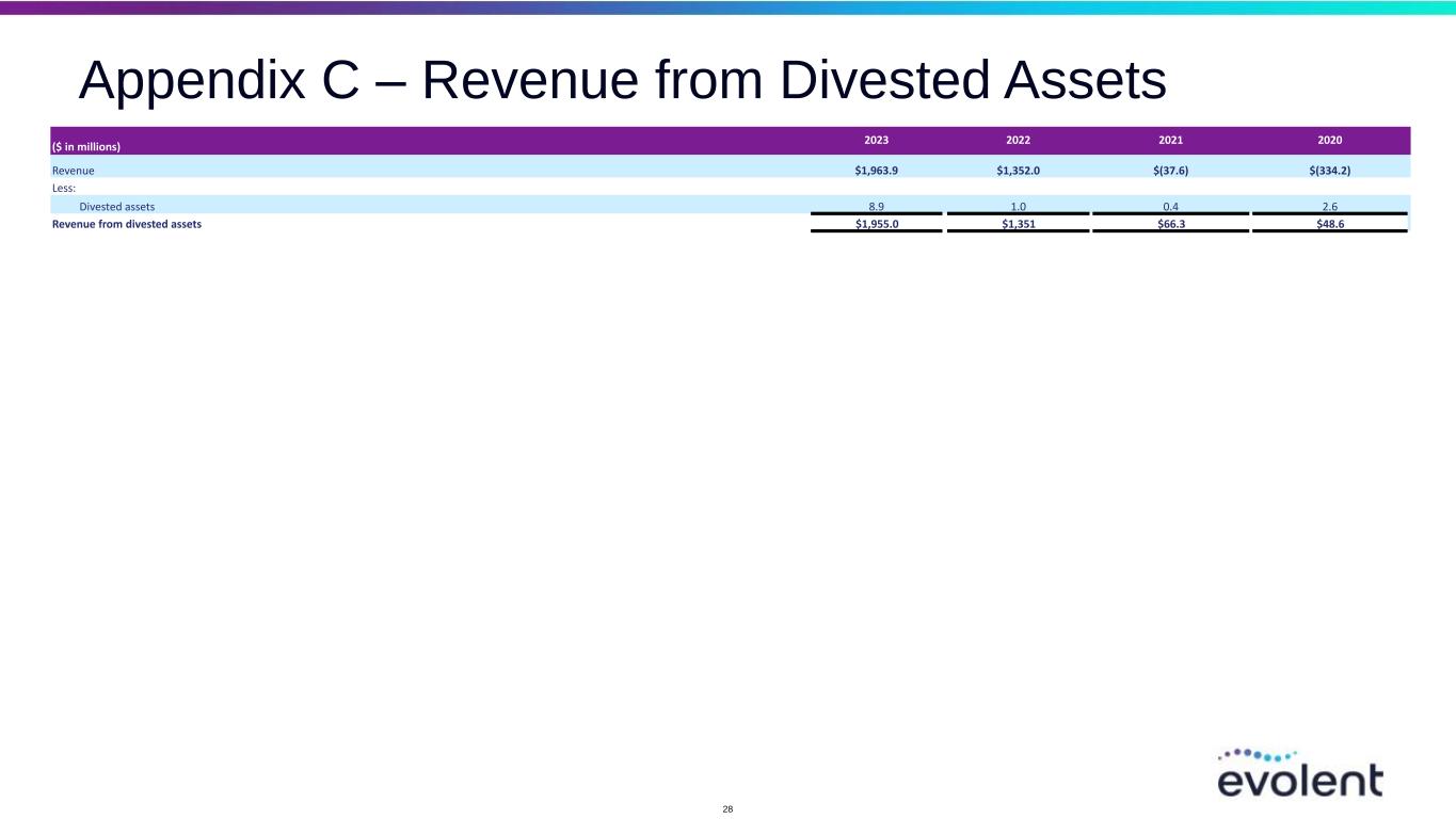 Appendix C – Revenue from Divested Assets 28 ($ in millions) 2023 2022 2021 2020 Revenue $1,963.9 $1,352.0 $(37.6) $(334.2) Less: Divested assets 8.9 1.0 0.4 2.6 Revenue from divested assets $1,955.0 $1,351 $66.3 $48.6