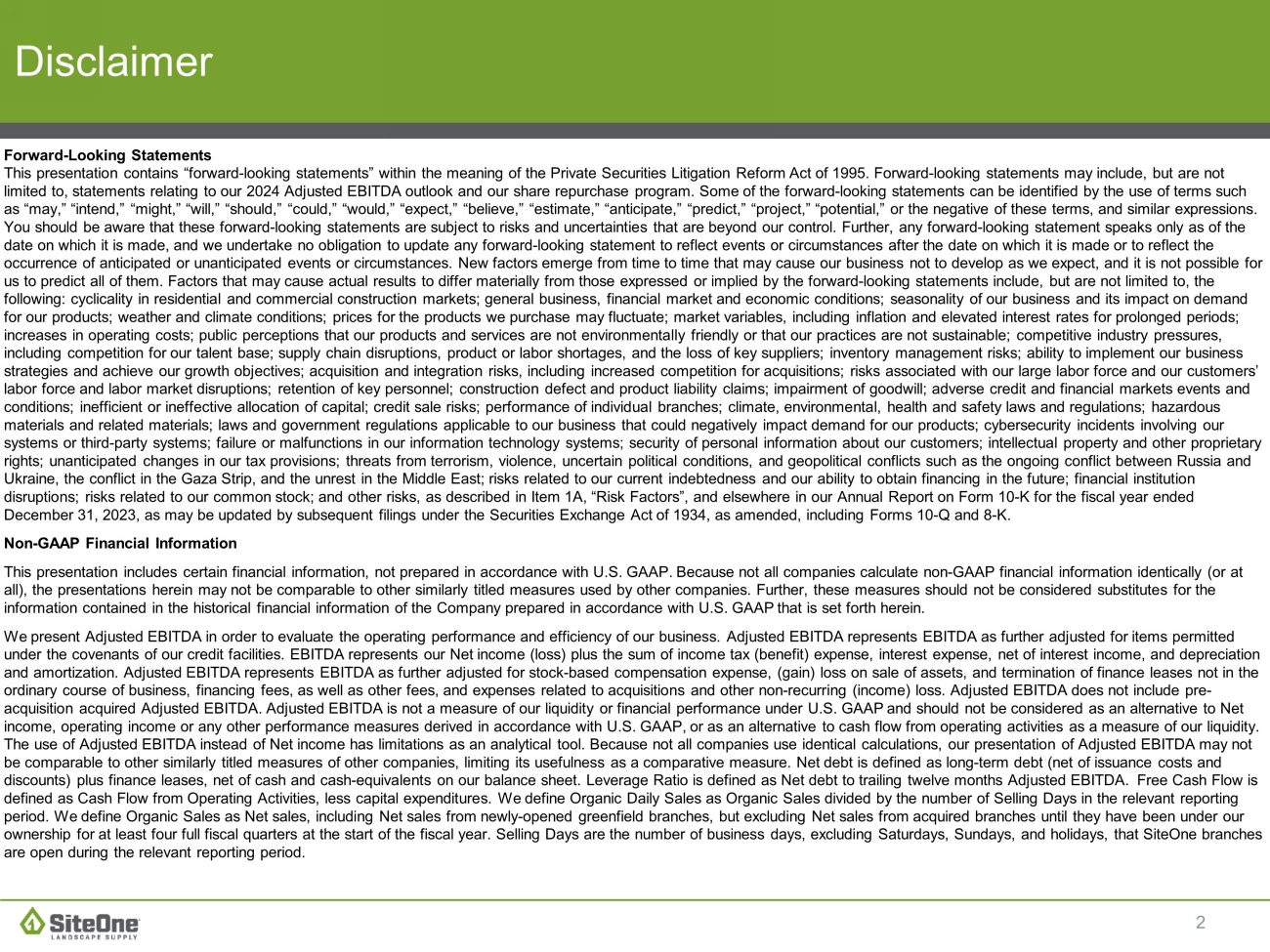 2 Disclaimer Forward - Looking Statements This presentation contains “forward - looking statements” within the meaning of the Private Securities Litigation Reform Act of 19 95. Forward - looking statements may include, but are not limited to, statements relating to our 2024 Adjusted EBITDA outlook and our share repurchase program. Some of the forward - lookin g statements can be identified by the use of terms such as “may,” “intend,” “might,” “will,” “should,” “could,” “would,” “expect,” “believe,” “estimate,” “anticipate,” “predict,” “p roj ect,” “potential,” or the negative of these terms, and similar expressions. You should be aware that these forward - looking statements are subject to risks and uncertainties that are beyond our control. Fu rther, any forward - looking statement speaks only as of the date on which it is made, and we undertake no obligation to update any forward - looking statement to reflect events or circumstan ces after the date on which it is made or to reflect the occurrence of anticipated or unanticipated events or circumstances. New factors emerge from time to time that may cause our b usi ness not to develop as we expect, and it is not possible for us to predict all of them. Factors that may cause actual results to differ materially from those expressed or implied by the for ward - looking statements include, but are not limited to, the following: cyclicality in residential and commercial construction markets; general business, financial market and economic co ndi tions; seasonality of our business and its impact on demand for our products; weather and climate conditions; prices for the products we purchase may fluctuate; market variables, includ ing inflation and elevated interest rates for prolonged periods; increases in operating costs; public perceptions that our products and services are not environmentally friendly or that our pra ctices are not sustainable; competitive industry pressures, including competition for our talent base; supply chain disruptions, product or labor shortages, and the loss of key supplier s; inventory management risks; ability to implement our business strategies and achieve our growth objectives; acquisition and integration risks, including increased competition for acquisit ion s; risks associated with our large labor force and our customers’ labor force and labor market disruptions; retention of key personnel; construction defect and product liability claims; impai rme nt of goodwill; adverse credit and financial markets events and conditions; inefficient or ineffective allocation of capital; credit sale risks; performance of individual branches; climate, en vironmental, health and safety laws and regulations; hazardous materials and related materials; laws and government regulations applicable to our business that could negatively impact dema nd for our products; cybersecurity incidents involving our systems or third - party systems; failure or malfunctions in our information technology systems; security of personal information about our customers; intellectual property and other proprietary rights; unanticipated changes in our tax provisions; threats from terrorism, violence, uncertain political conditions, and ge opo litical conflicts such as the ongoing conflict between Russia and Ukraine, the conflict in the Gaza Strip, and the unrest in the Middle East; risks related to our current indebtedness and our ab ility to obtain financing in the future; financial institution disruptions; risks related to our common stock; and other risks, as described in Item 1A, “Risk Factors”, and elsewhere in ou r A nnual Report on Form 10 - K for the fiscal year ended December 31, 2023, as may be updated by subsequent filings under the Securities Exchange Act of 1934, as amended, including F orm s 10 - Q and 8 - K. Non - GAAP Financial Information This presentation includes certain financial information, not prepared in accordance with U.S. GAAP. Because not all companie s c alculate non - GAAP financial information identically (or at all), the presentations herein may not be comparable to other similarly titled measures used by other companies. Further, the se measures should not be considered substitutes for the information contained in the historical financial information of the Company prepared in accordance with U.S. GAAP that is se t f orth herein. We present Adjusted EBITDA in order to evaluate the operating performance and efficiency of our business. Adjusted EBITDA rep res ents EBITDA as further adjusted for items permitted under the covenants of our credit facilities. EBITDA represents our Net income (loss) plus the sum of income tax (benefit) ex pen se, interest expense, net of interest income, and depreciation and amortization. Adjusted EBITDA represents EBITDA as further adjusted for stock - based compensation expense, (gain) loss on sal e of assets, and termination of finance leases not in the ordinary course of business, financing fees, as well as other fees, and expenses related to acquisitions and other non - recurring (income) loss. Adjusted EBITDA does not include pre - acquisition acquired Adjusted EBITDA. Adjusted EBITDA is not a measure of our liquidity or financial performance under U.S. G AAP and should not be considered as an alternative to Net income, operating income or any other performance measures derived in accordance with U.S. GAAP, or as an alternative to cash fl ow from operating activities as a measure of our liquidity. The use of Adjusted EBITDA instead of Net income has limitations as an analytical tool. Because not all companies use identic al calculations, our presentation of Adjusted EBITDA may not be comparable to other similarly titled measures of other companies, limiting its usefulness as a comparative measure. Net de bt is defined as long - term debt (net of issuance costs and discounts) plus finance leases, net of cash and cash - e