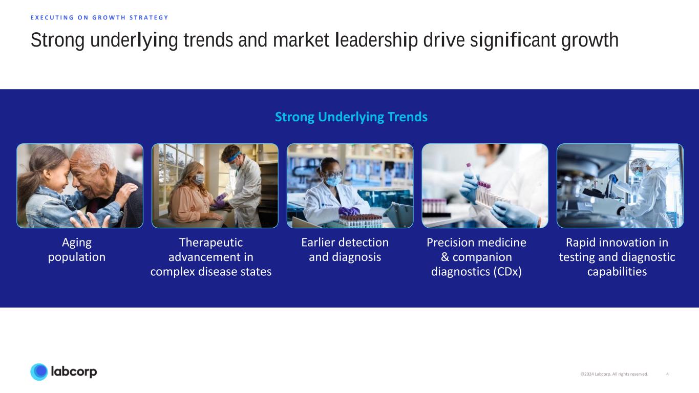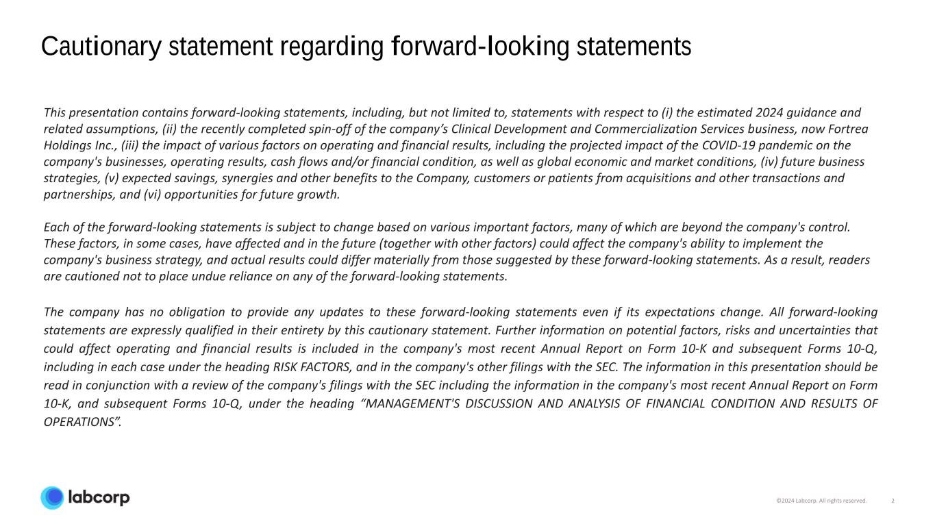 2 ©2024 Labcorp. All rights reserved. Cautionary statement regarding forward-looking statements This presentation contains forward-looking statements, including, but not limited to, statements with respect to (i) the estimated 2024 guidance and related assumptions, (ii) the recently completed spin-off of the company’s Clinical Development and Commercialization Services business, now Fortrea Holdings Inc., (iii) the impact of various factors on operating and financial results, including the projected impact of the COVID-19 pandemic on the company's businesses, operating results, cash flows and/or financial condition, as well as global economic and market conditions, (iv) future business strategies, (v) expected savings, synergies and other benefits to the Company, customers or patients from acquisitions and other transactions and partnerships, and (vi) opportunities for future growth. Each of the forward-looking statements is subject to change based on various important factors, many of which are beyond the company's control. These factors, in some cases, have affected and in the future (together with other factors) could affect the company's ability to implement the company's business strategy, and actual results could differ materially from those suggested by these forward-looking statements. As a result, readers are cautioned not to place undue reliance on any of the forward-looking statements. The company has no obligation to provide any updates to these forward-looking statements even if its expectations change. All forward-looking statements are expressly qualified in their entirety by this cautionary statement. Further information on potential factors, risks and uncertainties that could affect operating and financial results is included in the company's most recent Annual Report on Form 10-K and subsequent Forms 10-Q, including in each case under the heading RISK FACTORS, and in the company's other filings with the SEC. The information in this presentation should be read in conjunction with a review of the company's filings with the SEC including the information in the company's most recent Annual Report on Form 10-K, and subsequent Forms 10-Q, under the heading “MANAGEMENT'S DISCUSSION AND ANALYSIS OF FINANCIAL CONDITION AND RESULTS OF OPERATIONS”.