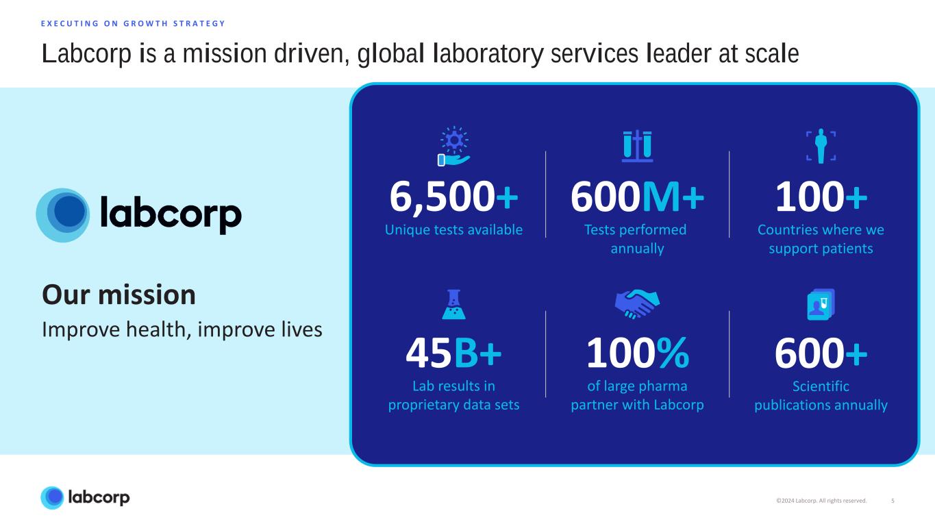 4 ©2024 Labcorp. All rights reserved. Strong underlying trends and market leadership drive significant growth E X E C U T I N G O N G R O W T H S T R A T E G Y Therapeutic advancement in complex disease states Earlier detection and diagnosis Precision medicine & companion diagnostics (CDx) Rapid innovation in testing and diagnostic capabilities Strong Underlying Trends Aging population
