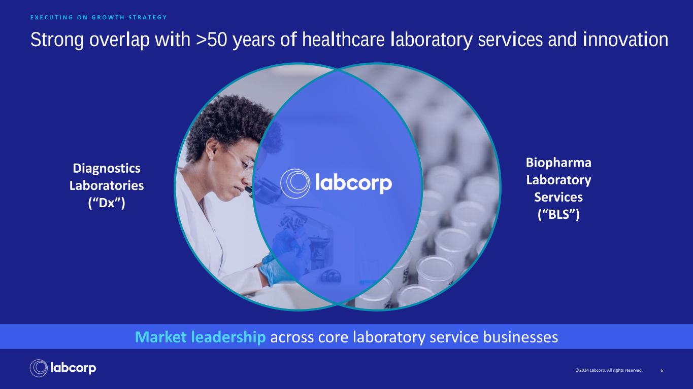 5 ©2024 Labcorp. All rights reserved. Labcorp is a mission driven, global laboratory services leader at scale E X E C U T I N G O N G R O W T H S T R A T E G Y Our mission Improve health, improve lives 100+ Countries where we support patients 6,500+ Unique tests available 600M+ Tests performed annually 600+ Scientific publications annually 45B+ Lab results in proprietary data sets 100% of large pharma partner with Labcorp