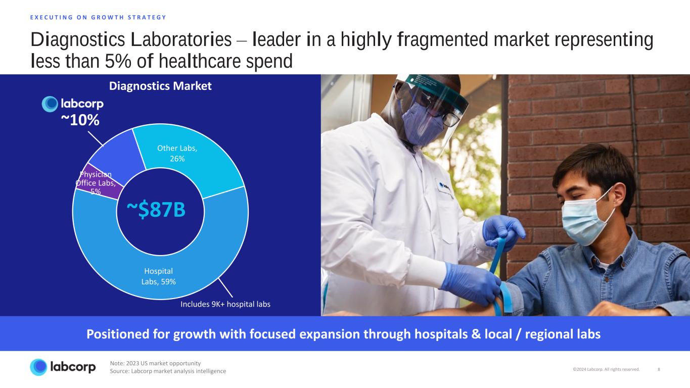 7 ©2024 Labcorp. All rights reserved. Best-in-class global lab operation with expansive footprint and scale E X E C U T I N G O N G R O W T H S T R A T E G Y United States and Canada Europe Geneva, Switzerland Mechelen, Belgium Harrogate, U.K. York, U.K. Shardlow, U.K. Huntingdon, U.K. Eye, U.K. Münster, Germany Asia Singapore Shanghai, China Kawagoe, Japan Suzhou, China Diagnostics: 4,500+ logistic vehicles cover 85,000+ stops per day Biopharma Labs: Managing over 2.5 million yearly inbound and outbound shipments covering nearly 100 countries Spokane, WA San Francisco, CA Calabasas, CA Los Angeles, CA San Diego, CA Phoenix, AZ Santa Fe, NM Denver, CO San Antonio, TX Houston, TX Oklahoma City, OK Southaven, MS Brentwood, TN Atlanta, GA St. Paul, MN Itasca, IL Burlington, NC RTP, NC Baltimore, MD Shelton, CT Westborough, MA Buffalo, NY Seattle, WA Dallas, TX Birmingham, AL Tampa, FL Dublin, OH Raritan, NJ Troy, MI Oak Creek, WI Hollywood, FL Austin, TX Knoxville, TN San Carlos, CA Indianapolis, IN Greenfield, IN Ann Arbor, MI Bedford, MA Chantilly, VA British Columbia Alberta, CA Manitoba, CA Ontario, CA Montreal, CA Ottawa, CA Brampton, CA London, CA Portland, OR Eugene, OR Labs qualified for both Dx and BLS testing
