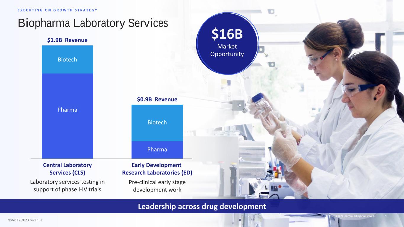 8 ©2024 Labcorp. All rights reserved. Diagnostics Laboratories – leader in a highly fragmented market representing less than 5% of healthcare spend E X E C U T I N G O N G R O W T H S T R A T E G Y Diagnostics Market Positioned for growth with focused expansion through hospitals & local / regional labs Note: 2023 US market opportunity Source: Labcorp market analysis intelligence Hospital Labs, 59% Physician Office Labs, 5% Other Labs, 26% ~$87B Includes 9K+ hospital labs ~10%