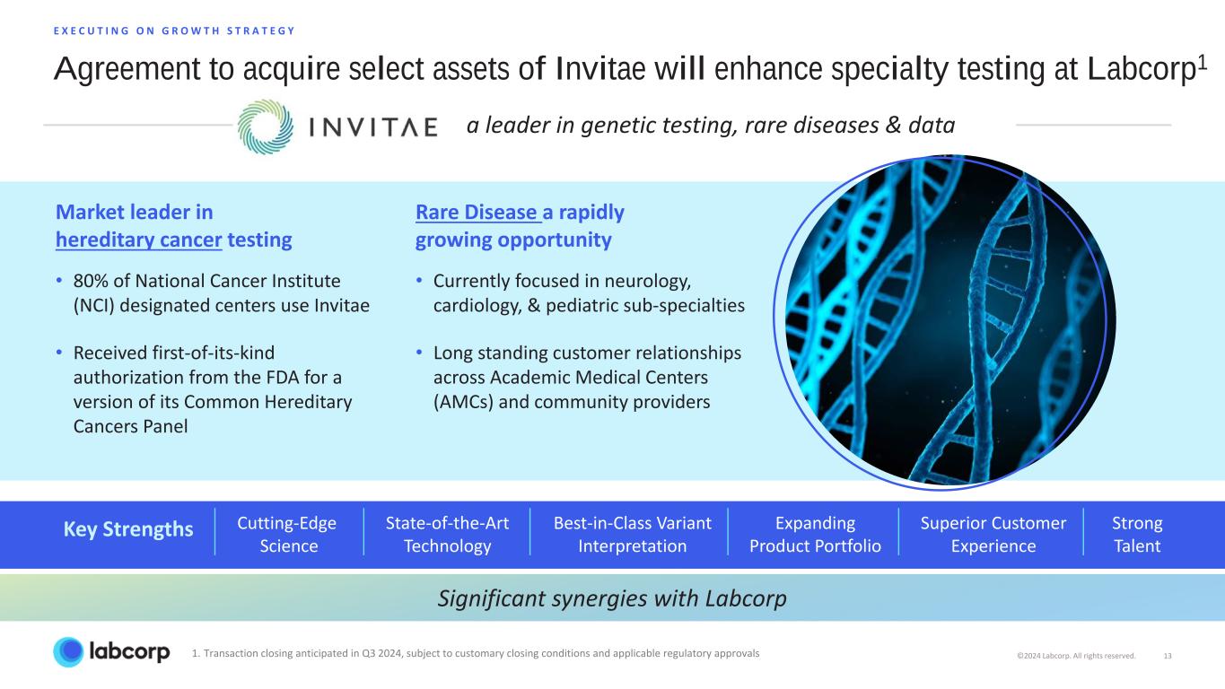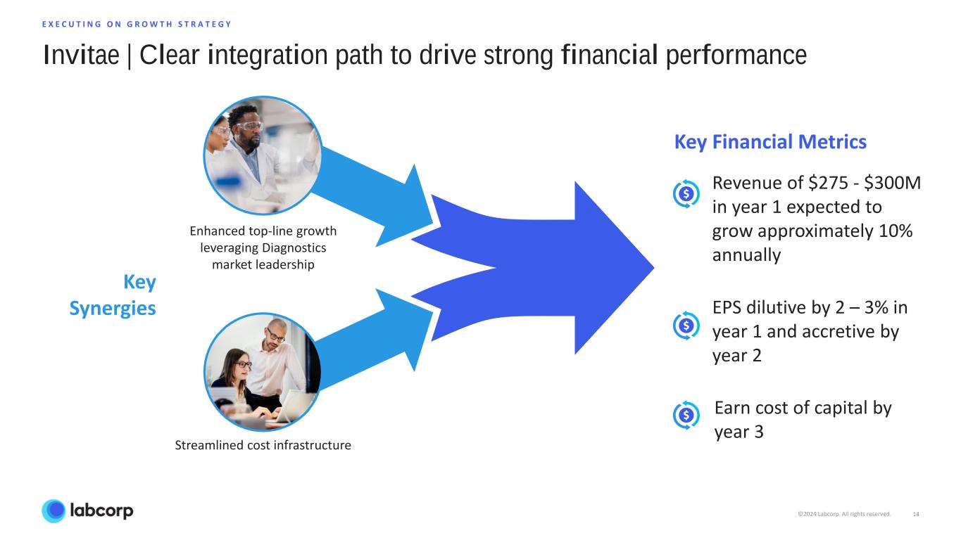 13 ©2024 Labcorp. All rights reserved. Agreement to acquire select assets of Invitae will enhance specialty testing at Labcorp1 E X E C U T I N G O N G R O W T H S T R A T E G Y a leader in genetic testing, rare diseases & data Market leader in hereditary cancer testing • 80% of National Cancer Institute (NCI) designated centers use Invitae • Received first-of-its-kind authorization from the FDA for a version of its Common Hereditary Cancers Panel Rare Disease a rapidly growing opportunity • Currently focused in neurology, cardiology, & pediatric sub-specialties • Long standing customer relationships across Academic Medical Centers (AMCs) and community providers Strong Talent State-of-the-Art Technology Expanding Product Portfolio Cutting-Edge Science Key Strengths Best-in-Class Variant Interpretation 1. Transaction closing anticipated in Q3 2024, subject to customary closing conditions and applicable regulatory approvals Superior Customer Experience Significant synergies with Labcorp