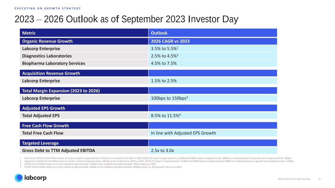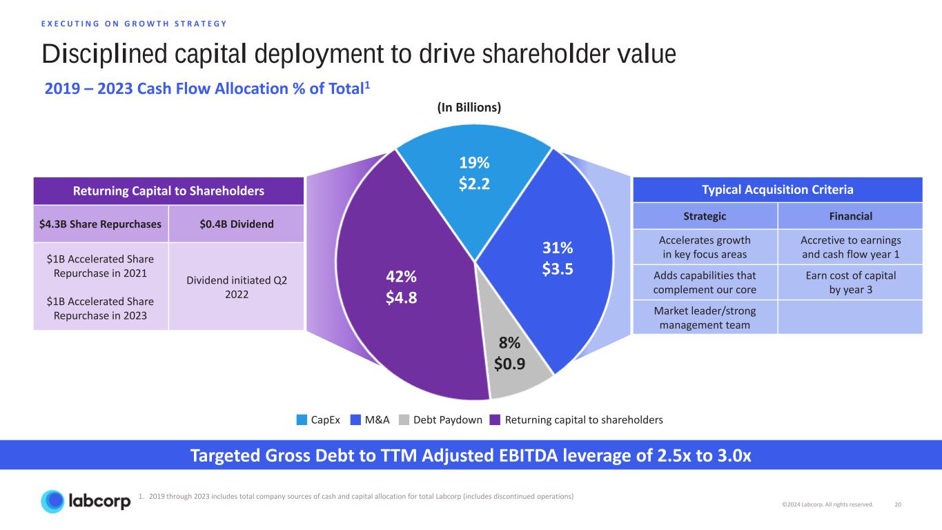 19 ©2024 Labcorp. All rights reserved. 2023 – 2026 Outlook as of September 2023 Investor Day Metric Outlook Organic Revenue Growth 2026 CAGR vs 2023 Labcorp Enterprise 3.5% to 5.5%1 Diagnostics Laboratories 2.5% to 4.5%2 Biopharma Laboratory Services 4.5% to 7.5% Acquisition Revenue Growth Labcorp Enterprise 1.5% to 2.5% Total Margin Expansion (2023 to 2026) Labcorp Enterprise 100bps to 150bps3 Adjusted EPS Growth Total Adjusted EPS 8.5% to 11.5%4 Free Cash Flow Growth Total Free Cash Flow In line with Adjusted EPS Growth Targeted Leverage Gross Debt to TTM Adjusted EBITDA 2.5x to 3.0x 1. Enterprise: COVID-19 and PAMA impact on 3-year outlook of approximately -70 bps at the midpoint; for 2024 vs 2023, COVID-19 impact of approximately -$120M and PAMA impact of approximately -$80M for combined impact on growth rate of approximately -160bps 2. Diagnostics: COVID-19 and PAMA impact on 3-year outlook of approximately -100 bps at the midpoint; for 2024 vs 2023, COVID-19 impact of approximately -$120M and PAMA impact of approximately -$80M for combined impact on growth rate of approximately -220bps 3. COVID-19 and PAMA impact on 3-year outlook of approximately -110bps at the midpoint and approximately -70bps impact on 2024 4. COVID-19 and PAMA impact on 3-year outlook of approximately -300bps at the midpoint and approximately -800bps impact on 2024 growth rate versus 2023 E X E C U T I N G O N G R O W T H S T R A T E G Y