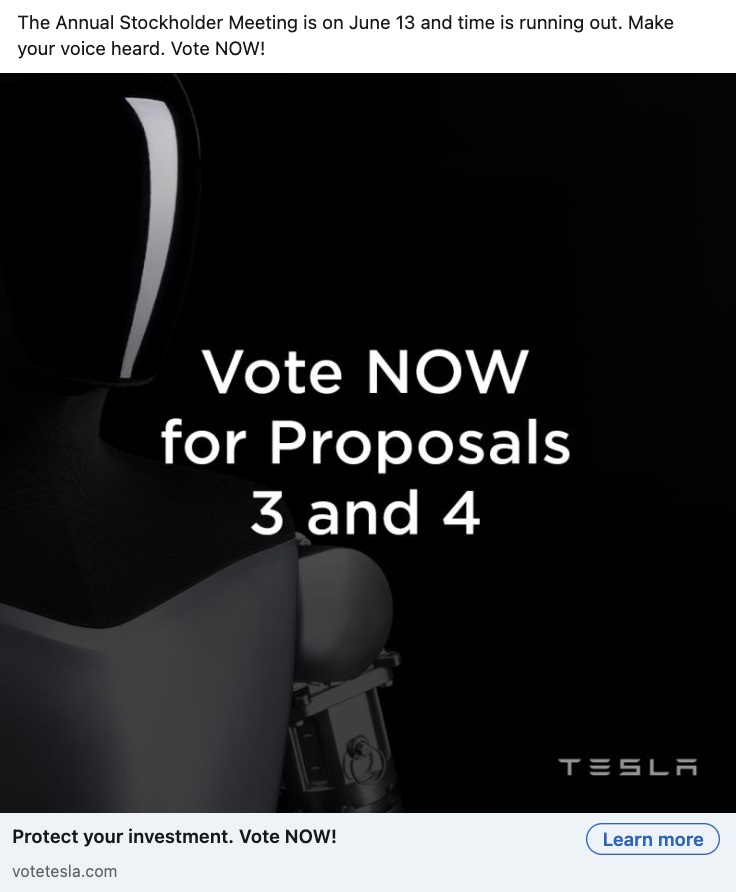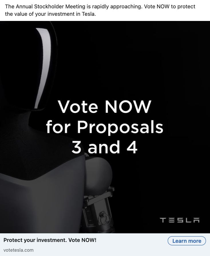 Tesla, Inc. (“Tesla”) has filed with the Securities and Exchange Commission (the “SEC”) a definitive proxy statement on Schedule 14A with respect to its solicitation of proxies for Tesla’s 2024 annual meeting (the “Definitive Proxy Statement”). The Definitive Proxy Statement contains important information about the matters to be voted on at the 2024 annual meeting. STOCKHOLDERS OF TESLA ARE URGED TO READ THESE MATERIALS (INCLUDING ANY AMENDMENTS OR SUPPLEMENTS THERETO) AND ANY OTHER RELEVANT DOCUMENTS THAT TESLA HAS FILED OR WILL FILE WITH THE SEC BECAUSE THEY CONTAIN OR WILL CONTAIN IMPORTANT INFORMATION ABOUT TESLA AND THE MATTERS TO BE VOTED ON AT THE 2024 ANNUAL MEETING. Stockholders are able to obtain free copies of these documents and other documents filed with the SEC by Tesla through the website maintained by the SEC at www.sec.gov. In addition, stockholders are able to obtain free copies of these documents from Tesla by contacting Tesla’s Investor Relations by e-mail at ir@tesla.com, or by going to Tesla’s Investor Relations page on its website at ir.tesla.com.