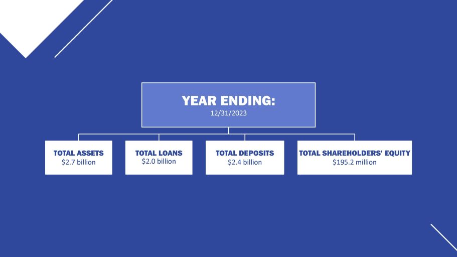 YEAR ENDING: 12/31/2023 TOTAL ASSETS $2.7 billion TOTAL LOANS $2.0 billion TOTAL DEPOSITS $2.4 billion TOTAL SHAREHOLDERS’ EQUITY $195.2 million