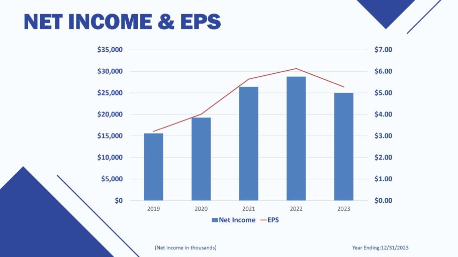 NET INCOME & EPS Year Ending:12/31/2023 (Net income in thousands) $0.00 $1.00 $2.00 $3.00 $4.00 $5.00 $6.00 $7.00 $0 $5,000 $10,000 $15,000 $20,000 $25,000 $30,000 $35,000 2019 2020 2022 2023 2021 Net Income EPS