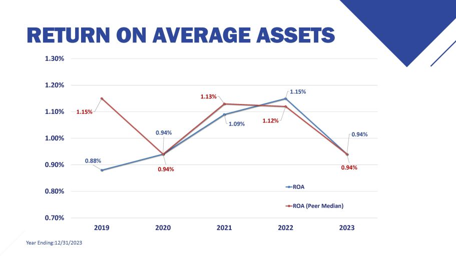 RETURN ON AVERAGE ASSETS Year Ending:12/31/2023 0.88% 0.94% 1.09% 1.15% 0.94% 1.15% 0.94% 1.13% 1.12% 0.94% 0.70% 0.80% 0.90% 1.00% 1.10% 1.30% 1.20% 2019 2020 2021 2022 2023 ROA ROA (Peer Median)