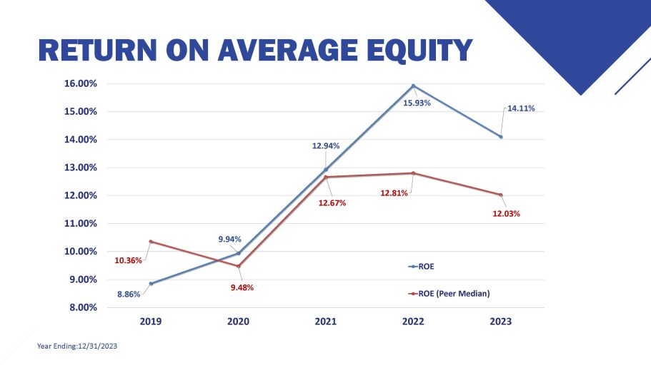 RETURN ON AVERAGE EQUITY Year Ending:12/31/2023 8.86% 9.94% 12.94% 15.93% 14.11% 10.36% 9.48% 12.67% 12.81% 12.03% 8.00% 9.00% 10.00% 11.00% 12.00% 13.00% 14.00% 15.00% 16.00% 2019 2020 2021 2022 2023 ROE ROE (Peer Median)