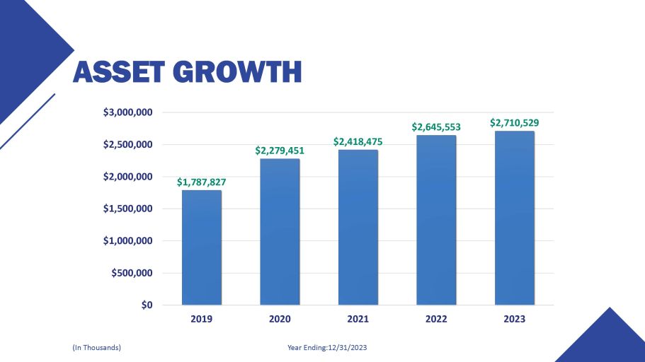 ASSET GROWTH 2020 2021 Year Ending:12/31/2023 (In Thousands) $1,787,827 $2,279,451 $2,418,475 $2,645,553 $2,710,529 $1,500,000 $1,000,000 $500,000 $0 $2,000,000 $2,500,000 $3,000,000 2019 2022 2023