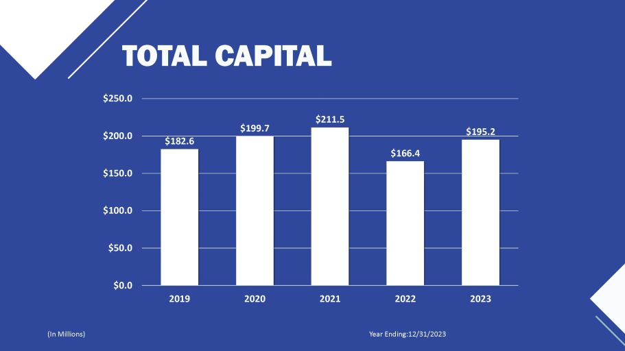 TOTAL CAPITAL Year Ending:12/31/2023 (In Millions) $182.6 $199.7 $211.5 $166.4 $195.2 $150.0 $100.0 $50.0 $0.0 $200.0 $250.0 2019 2020 2021 2022 2023
