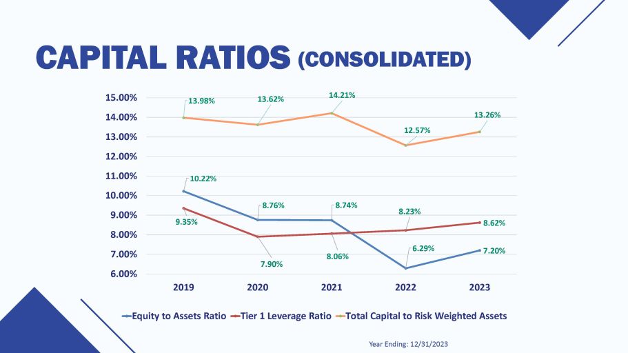 CAPITAL RATIOS (CONSOLIDATED) Year Ending: 12/31/2023 10.22% 8.76% 8.74% 6.29% 7.20% 9.35% 7.90% 8.06% 8.23% 8.62% 13.98% 13.62% 14.21% 12.57% 13.26% 6.00% 7.00% 8.00% 9.00% 10.00% 11.00% 12.00% 13.00% 14.00% 15.00% 2019 Equity to Assets Ratio 2020 2021 Tier 1 Leverage Ratio 2022 2023 Total Capital to Risk Weighted Assets