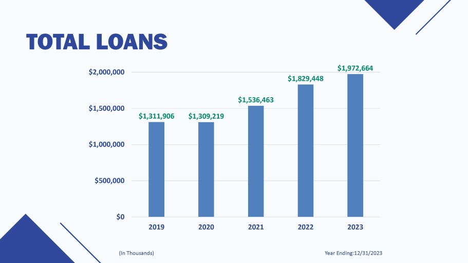 TOTAL LOANS Year Ending:12/31/2023 (In Thousands) $1,311,906 $1,309,219 $1,829,448 $1,536,463 $1,972,664 $0 $500,000 $1,000,000 $1,500,000 $2,000,000 2019 2020 2021 2022 2023