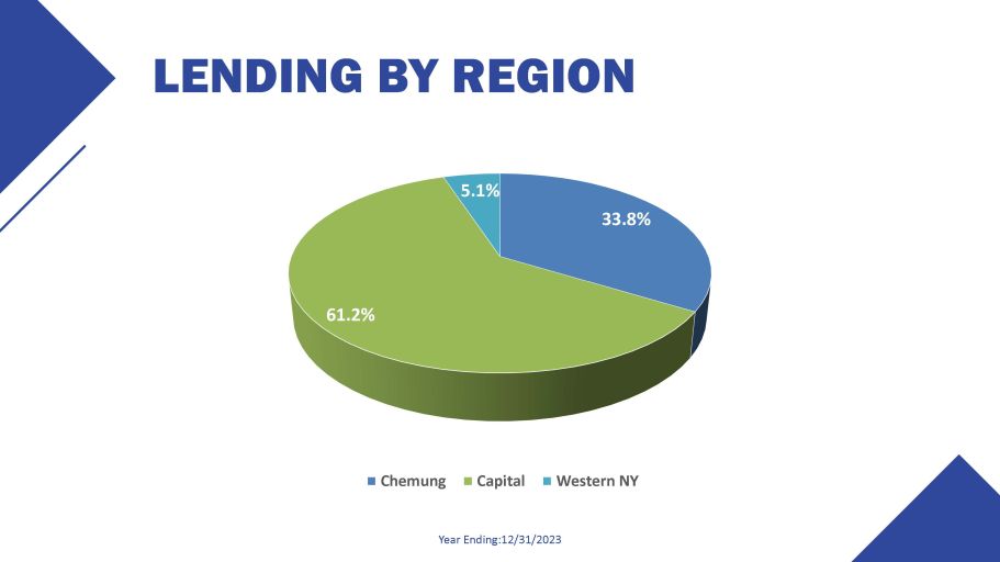 LENDING BY REGION Year Ending:12/31/2023 61.2% 5.1% 33.8% Chemung Capital Western NY